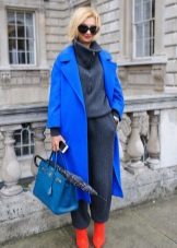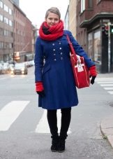 As accessories for a blue coat, you can choose, for example, terracotta elongated gloves, a red scarf, a red tippet, purple Loose, a delicate pink cravat, a purple hat, a soft blue in French style, a white bag, a black belt, coral bracelets , vintage brooch with a large stone in the color of the coat, beige boots, bright printed sneakers ...