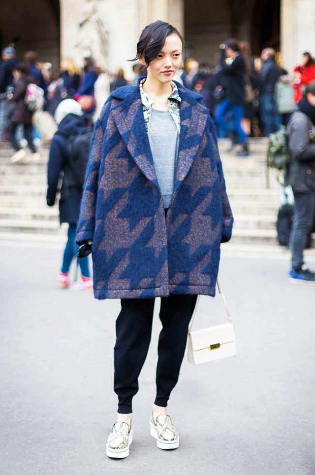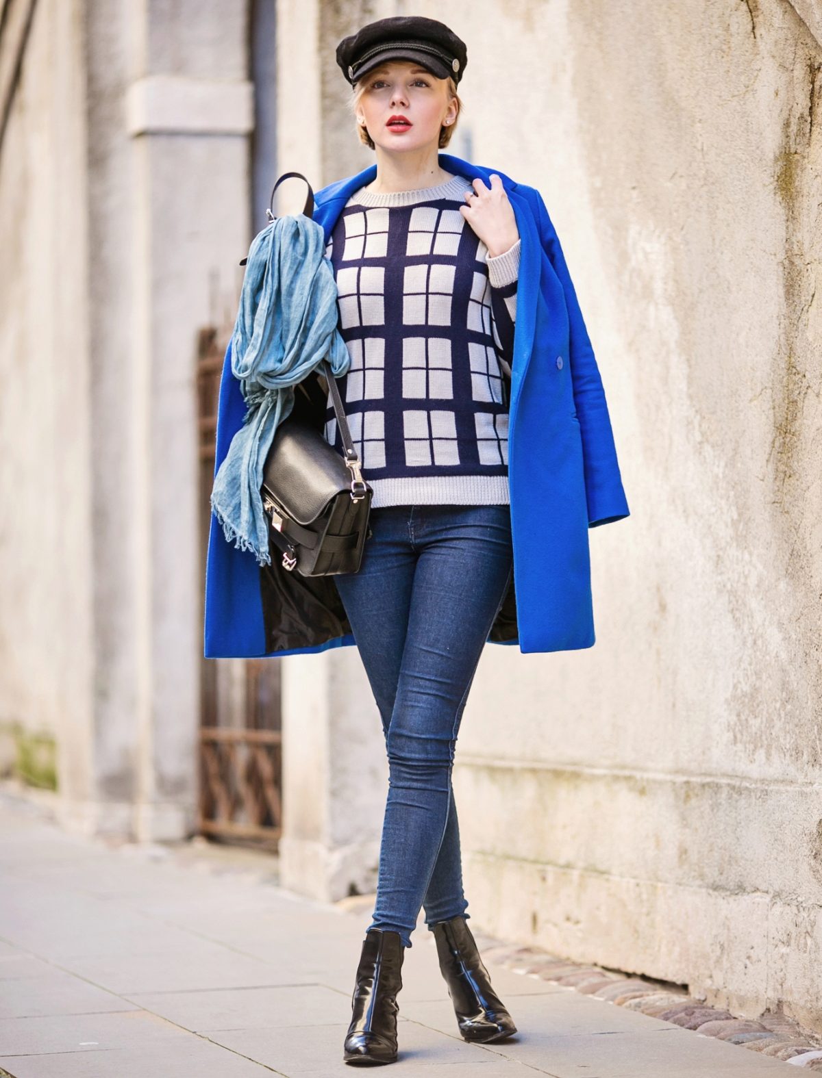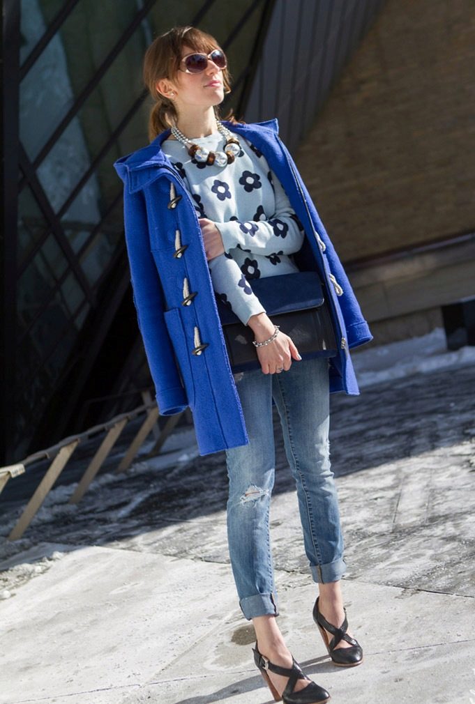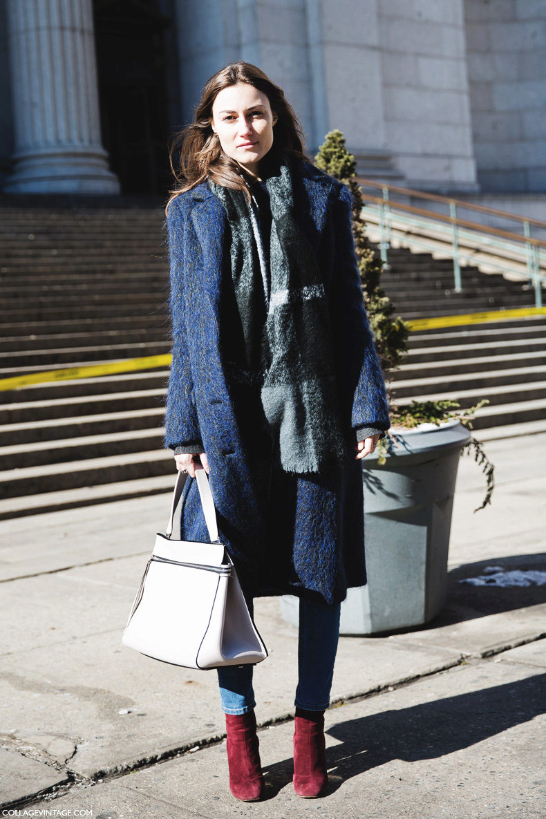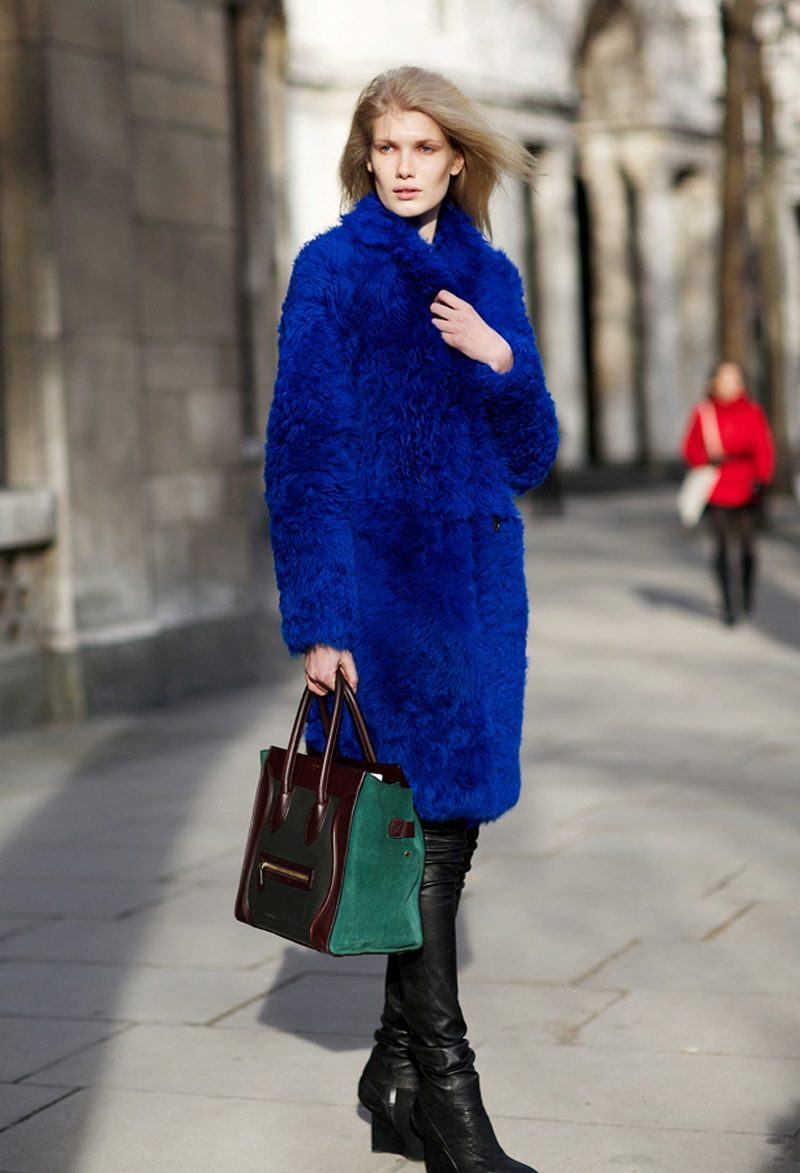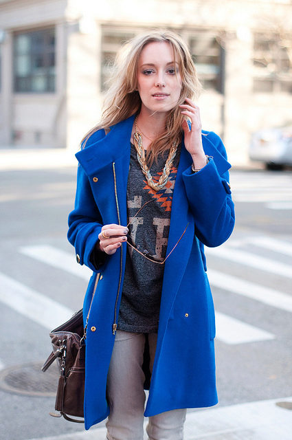 The oversized coat in blue can be “watered down” with skinny jeans and a oversized bag.