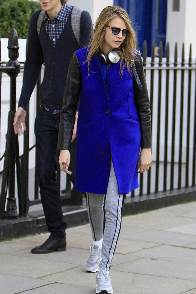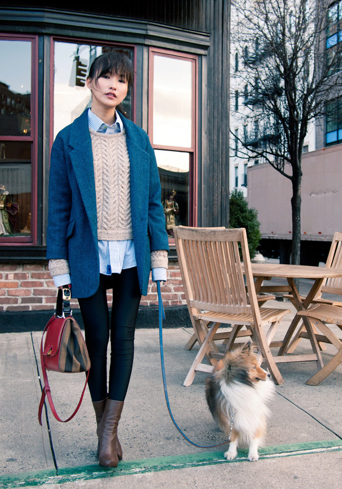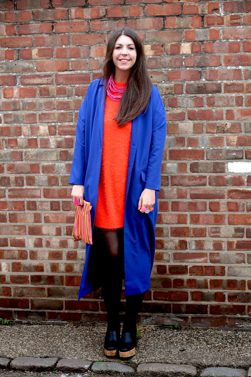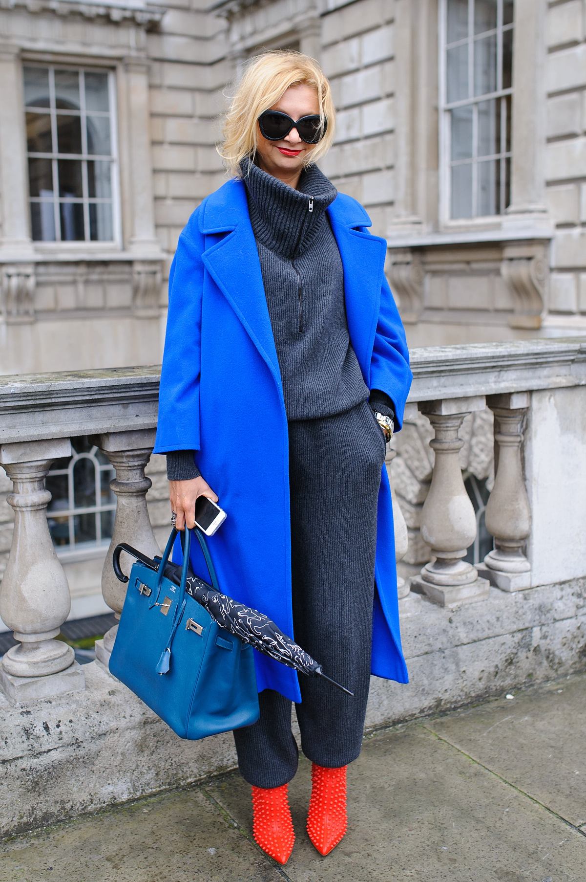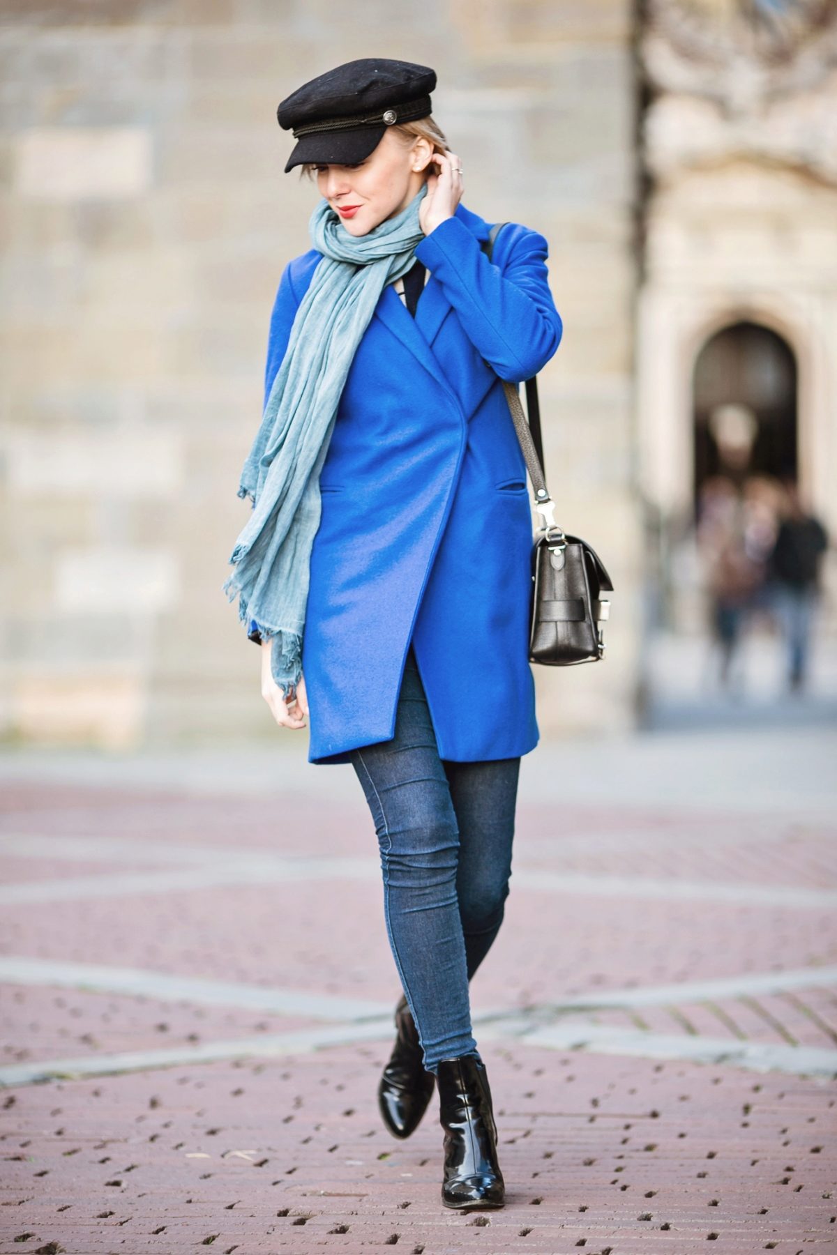 The oversized coat in blue can be “watered down” with skinny jeans and a oversized bag.