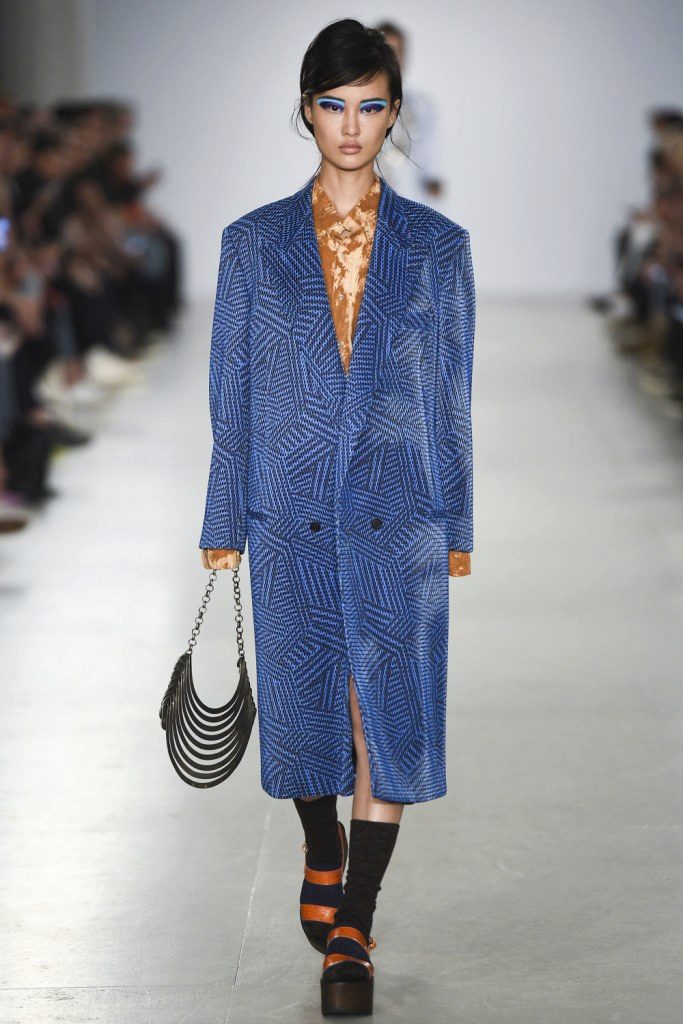The overcoat cocoon in blue overlays is tapering in the upper and lower parts, extending in the center and creating a memorable O-silhouette.