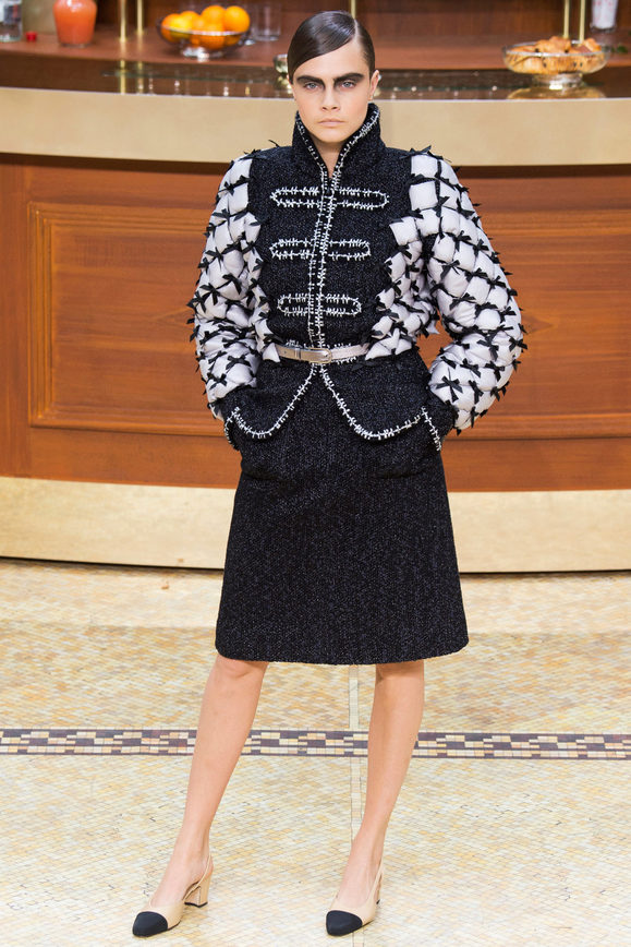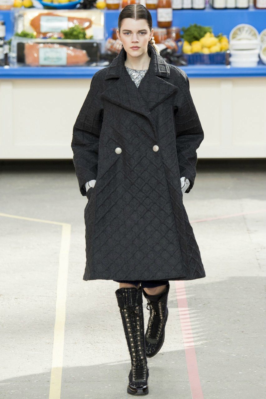 Chanel brand, as usual, delights with the elegance and sophistication of its images, combining almost incongruous, for example, oversized quilted coats with classic elements - a black, slightly shapeless free-cut coat, expanding downwards, but double-breasted, with two buttons, with an English collar.