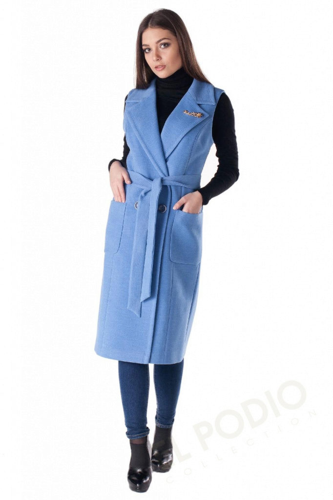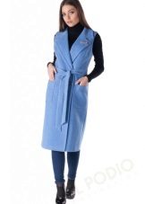 - a shortened version of a fitted coat without sleeves with large patch pockets, an English collar, with a wide soft belt made of the same fabric;
