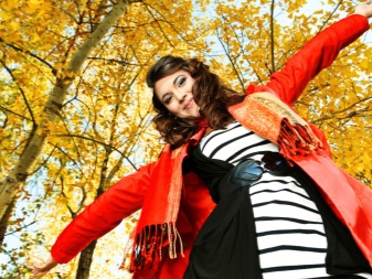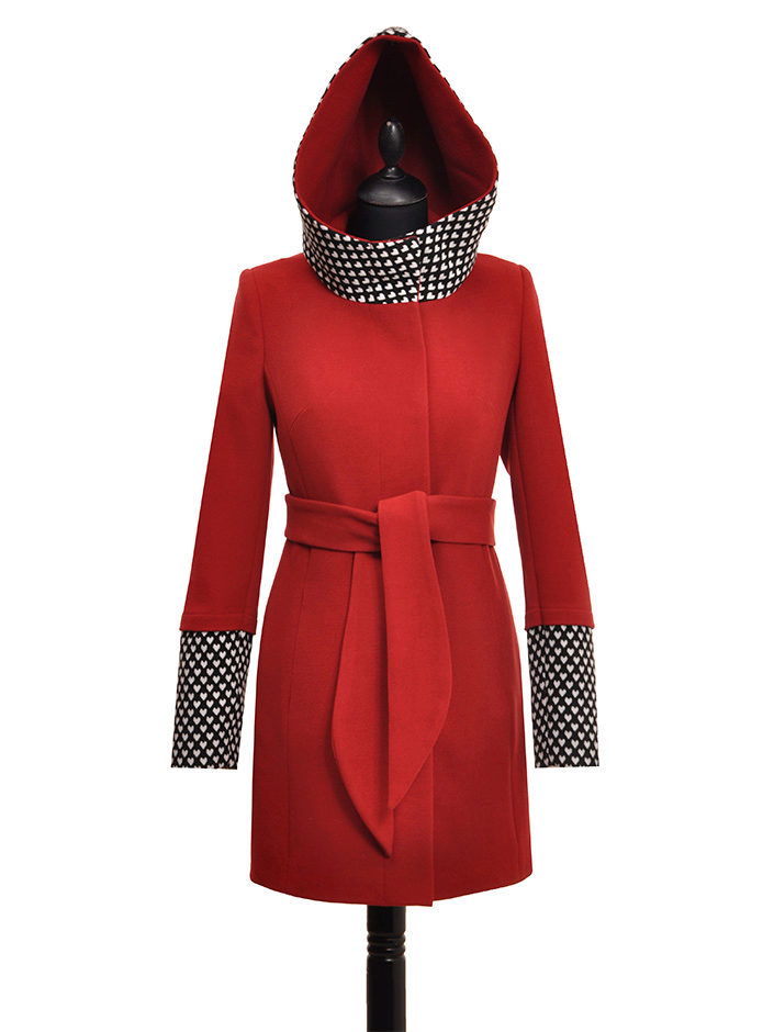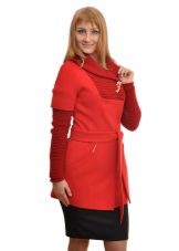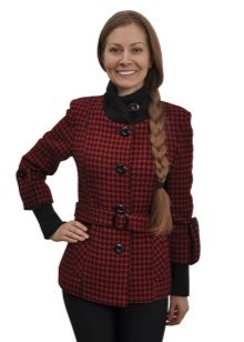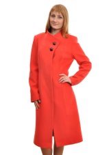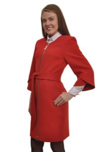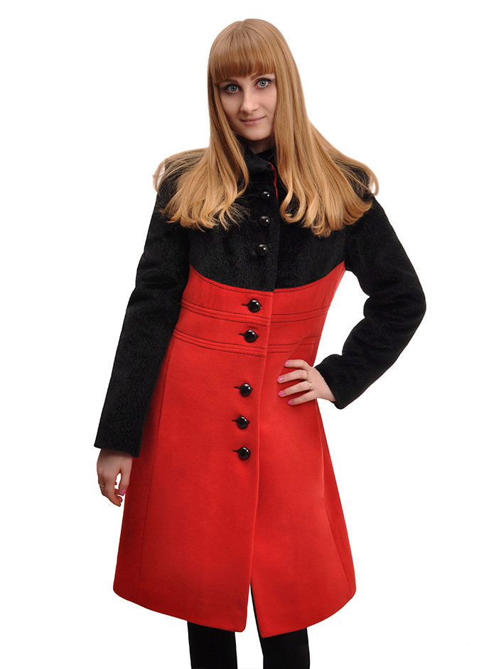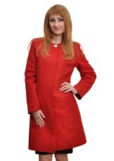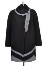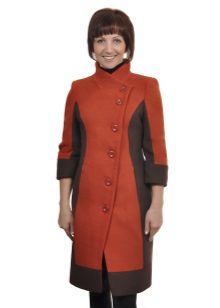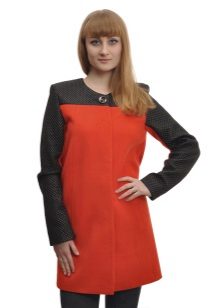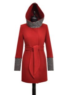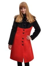 - a rather extravagant bright red-black coat with a high collar and a pattern on one shelf - for courageous ladies (not least, an aged woman can also wear such a coat, it will only emphasize the sophistication of the image);