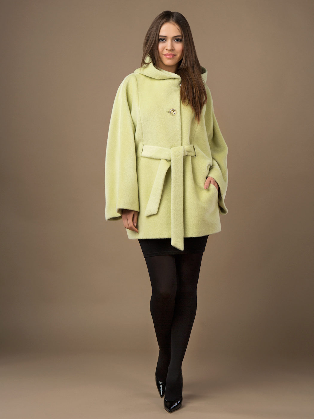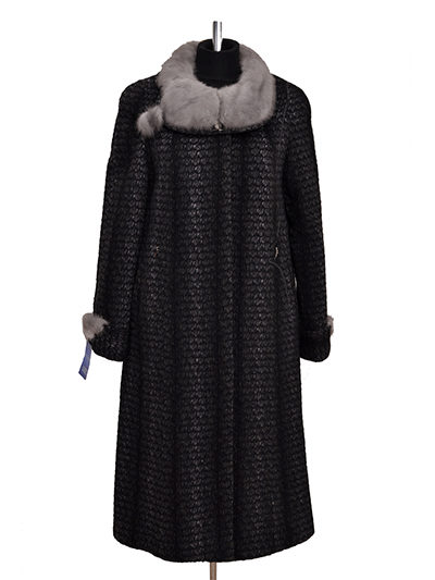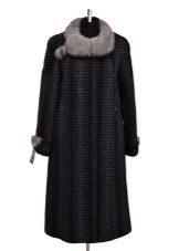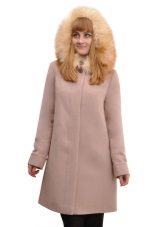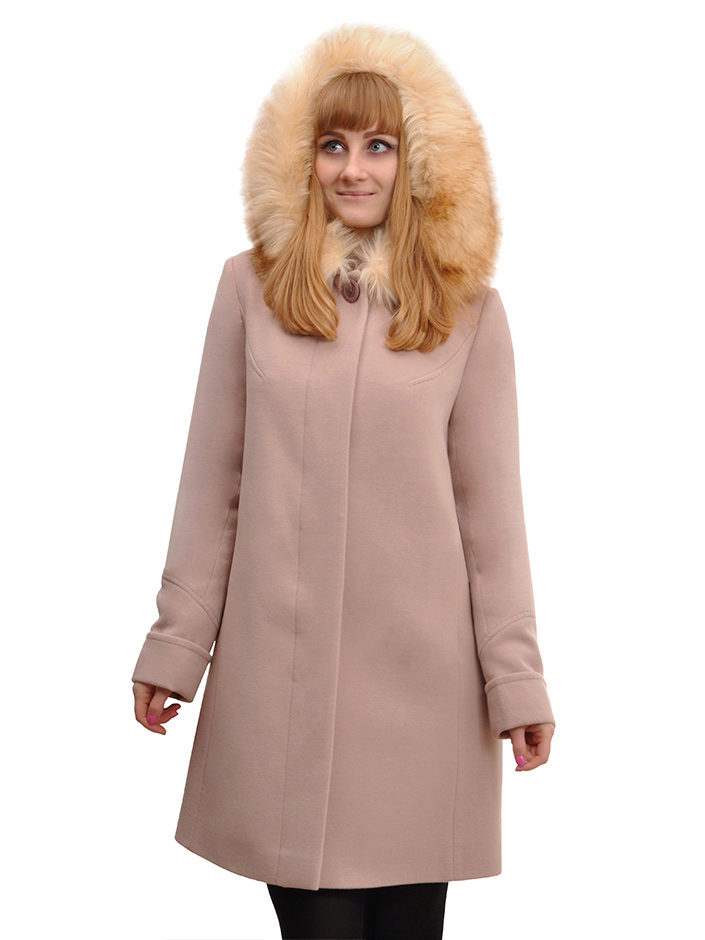 - classic cashmere coat semi-fitted with a hood, trimmed with fluffy light-colored artificial fur;