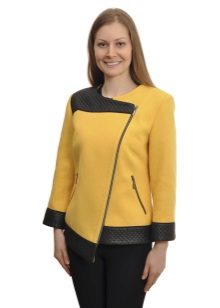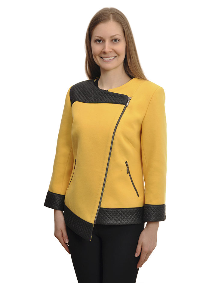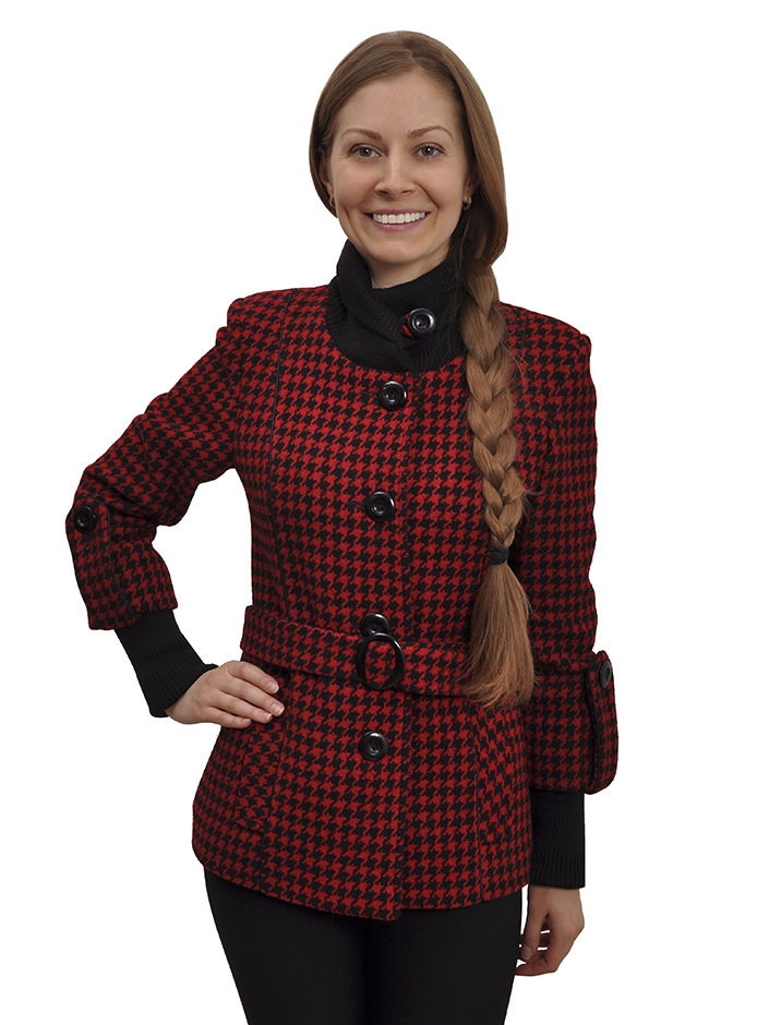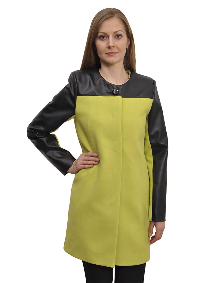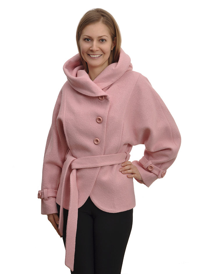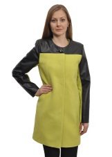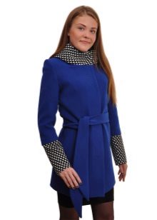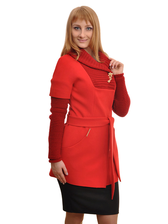 - short fitted short coat on a belt, with a sewn knitted high collar and the same high cuffs of contrasting colors;
