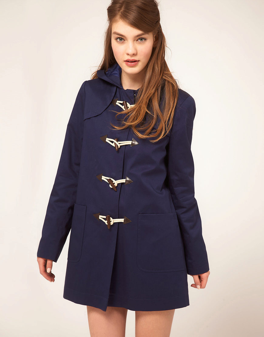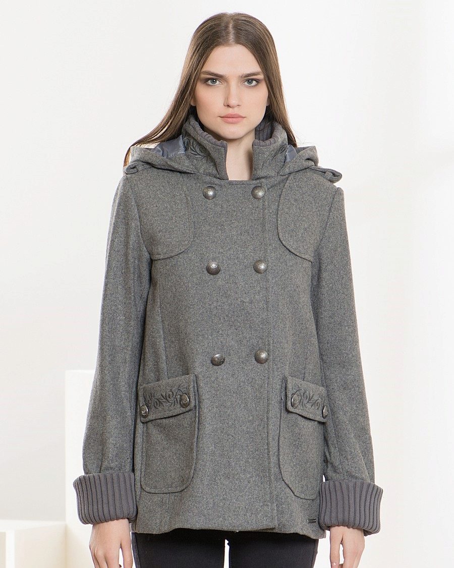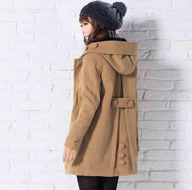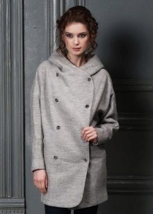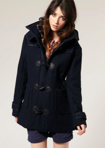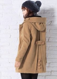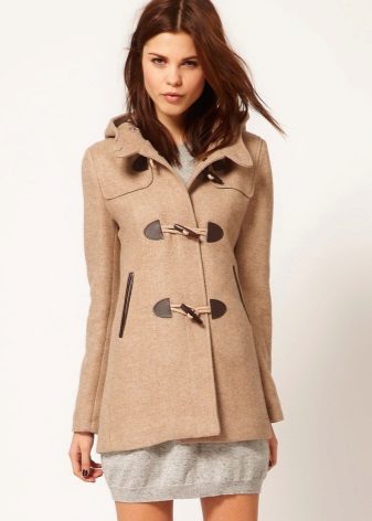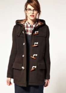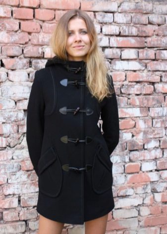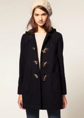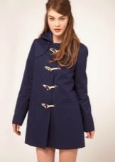The buttonhole clasp in the form of wolf tusks, the eyelets of which are made of cotton fabric as an independent element, is a distinctive feature of the coat model with a hood, which is called a duffle coat.