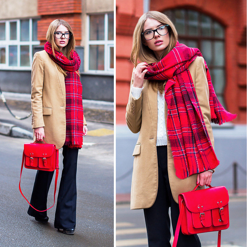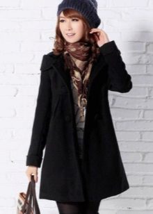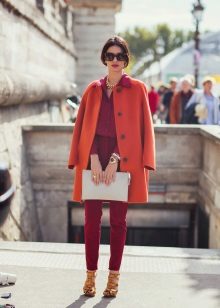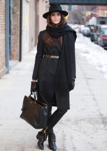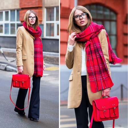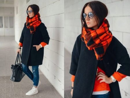 A very stylish and effective combination is obtained if you combine a black coat of classic length, made in the oversize style and a bright orange scarf in a cage, which will be the highlight of the image. With this product, you can safely combine jeans - boyfriends and white high-top sneakers, which will give the image a casual style. And if the coat has a wide sleeve to the elbow or 3/4, you can wear a warm cashmere sweater with a long sleeve in color matching the scarf.
