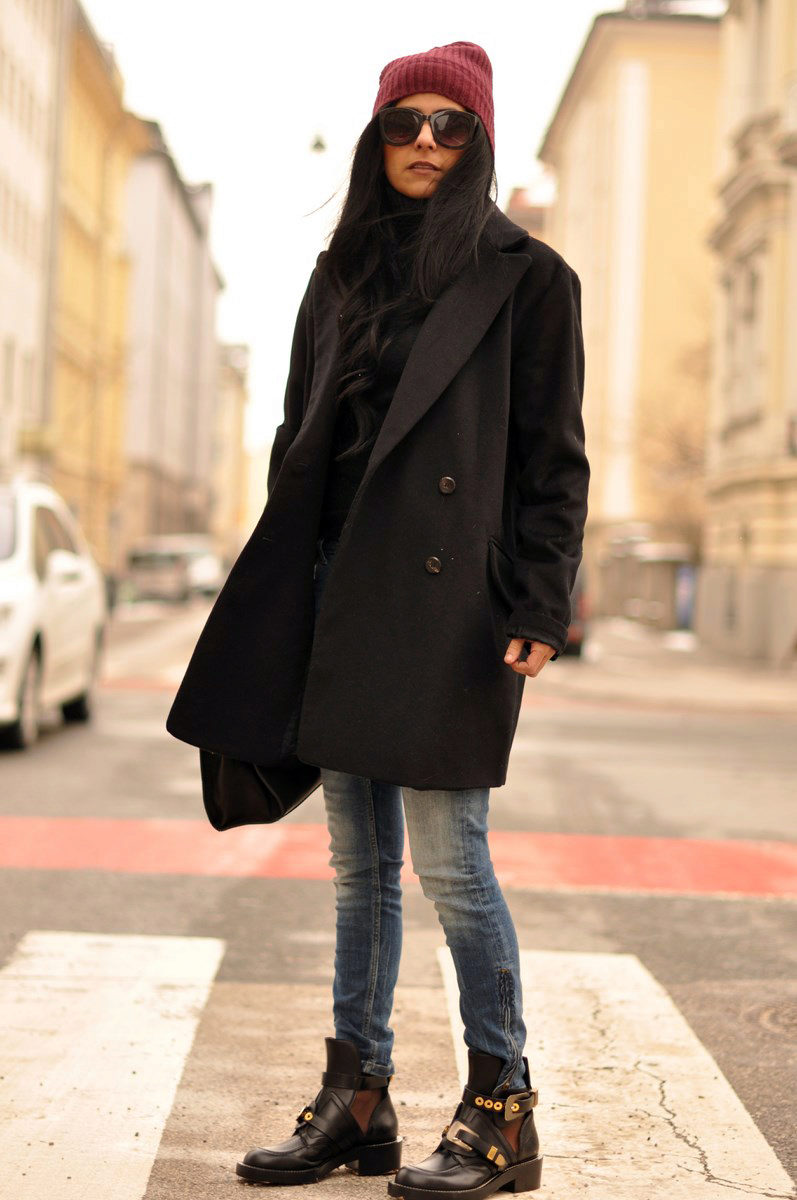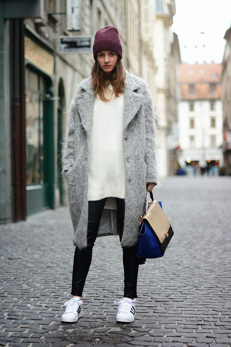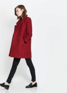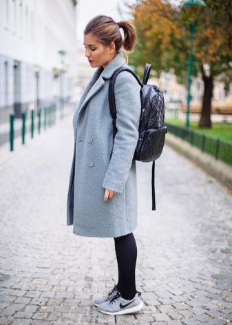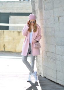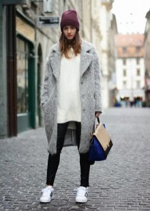 You should not wear a long coat with wide or flared trousers, it is better to use a skinny model or leggings. Sneakers are also not applicable, but solid-colored slipons will do.