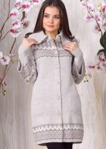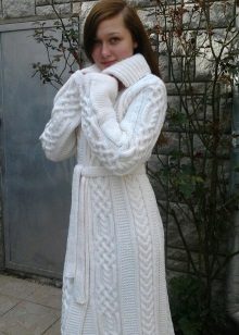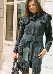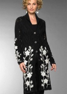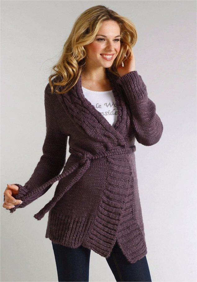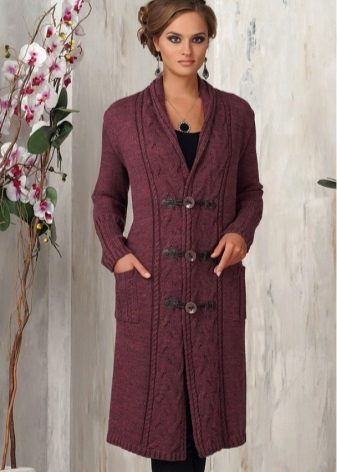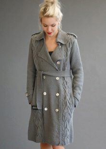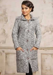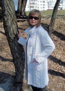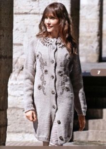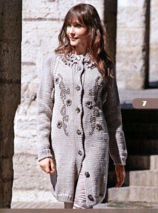 Knitted coat can be decorated initially or after purchase by its owner. Braid, sequins, fur, lace can be used to decorate such a product.