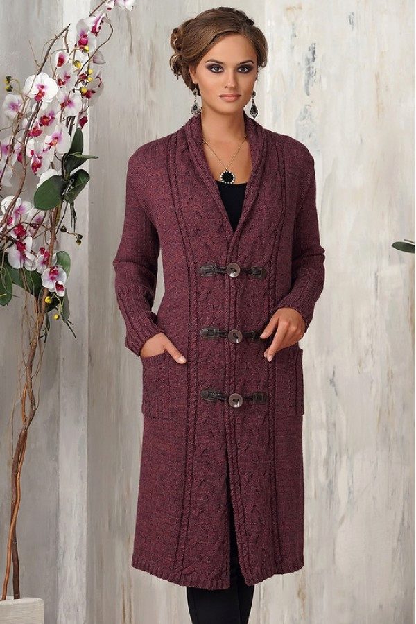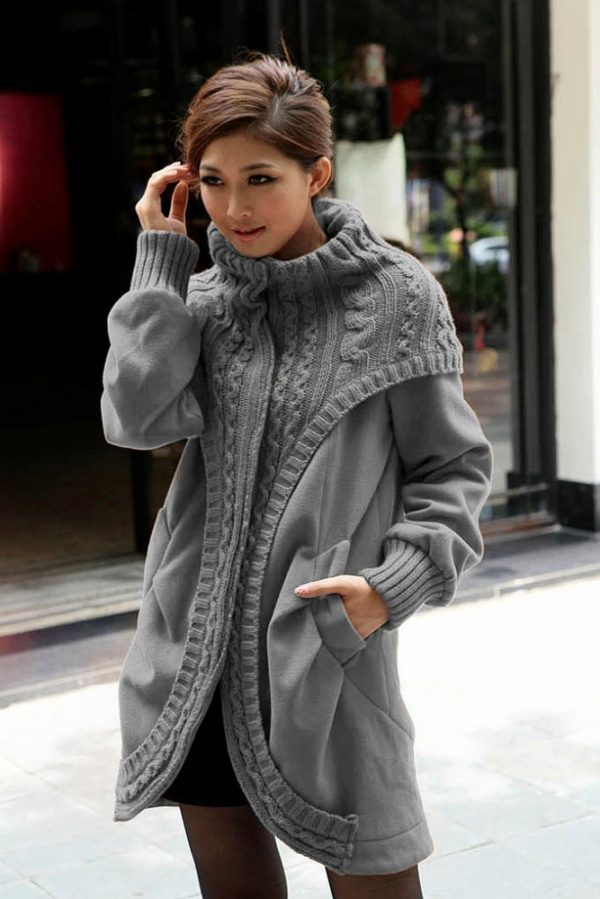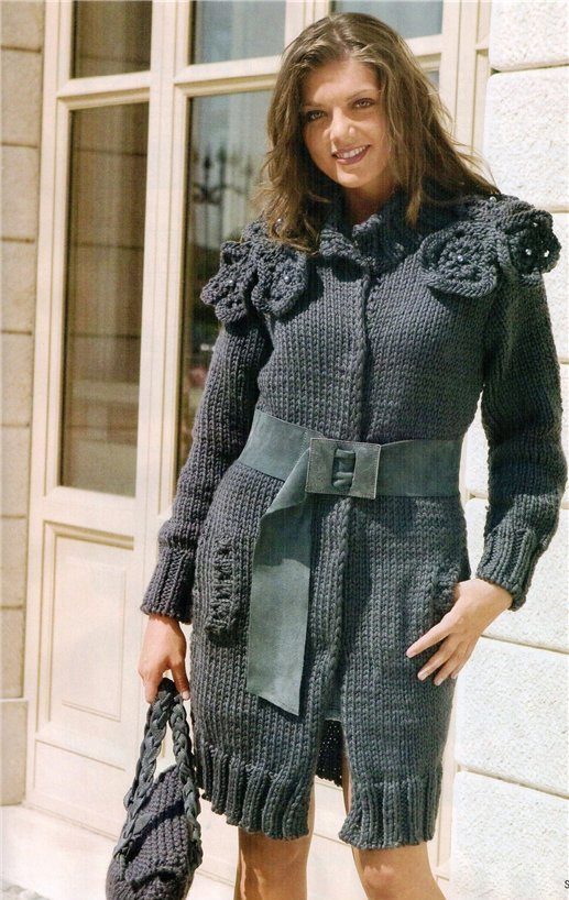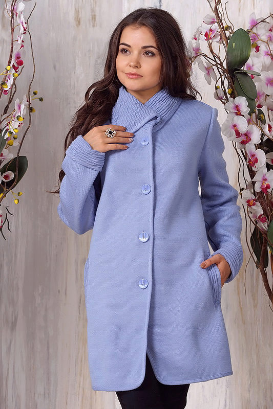 Depending on the style, knitted coats may have a shawl collar (classic feminine version), a stand-up collar (the same classic, but more strict), a large collar (trimmed with shaped yarn, down, fur, it focuses on your originality ) or be without a collar at all.
