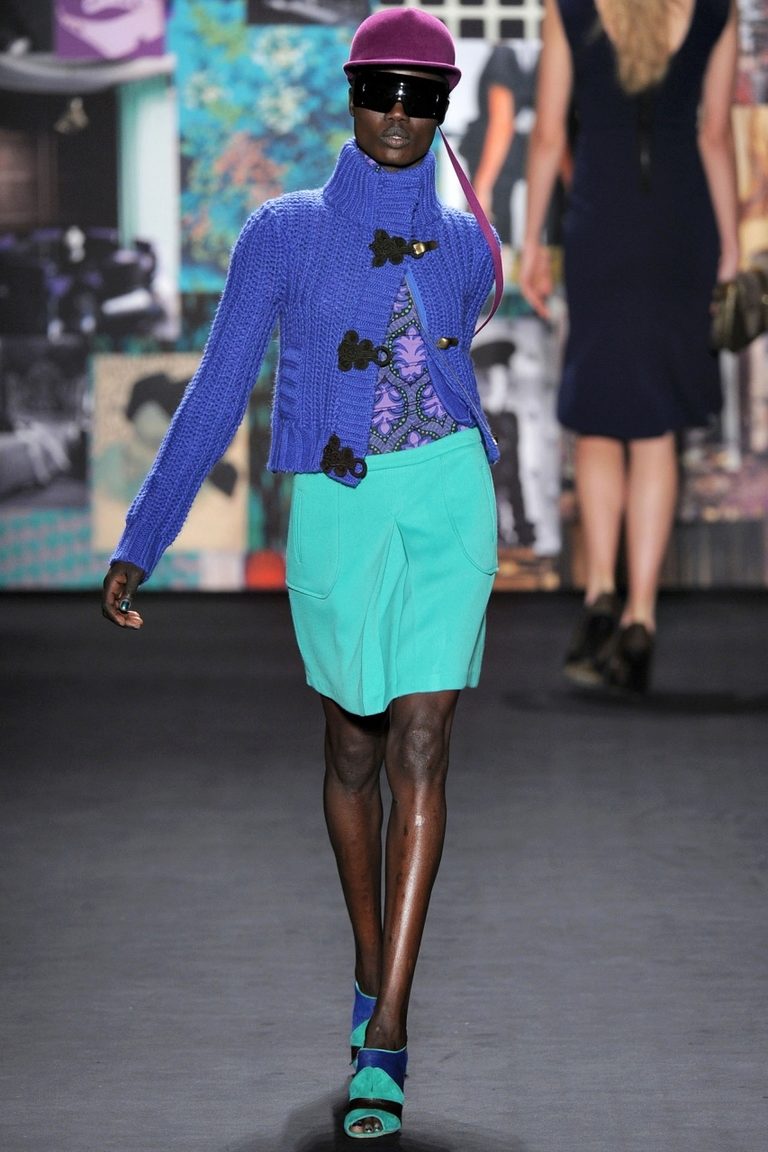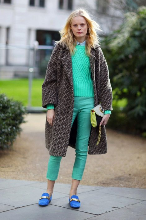 Sports style perfectly matches the whole range from green to blue. A double-breasted, short, crocheted coat of emerald color will greatly embellish your casual look in jeans and sneakers.
