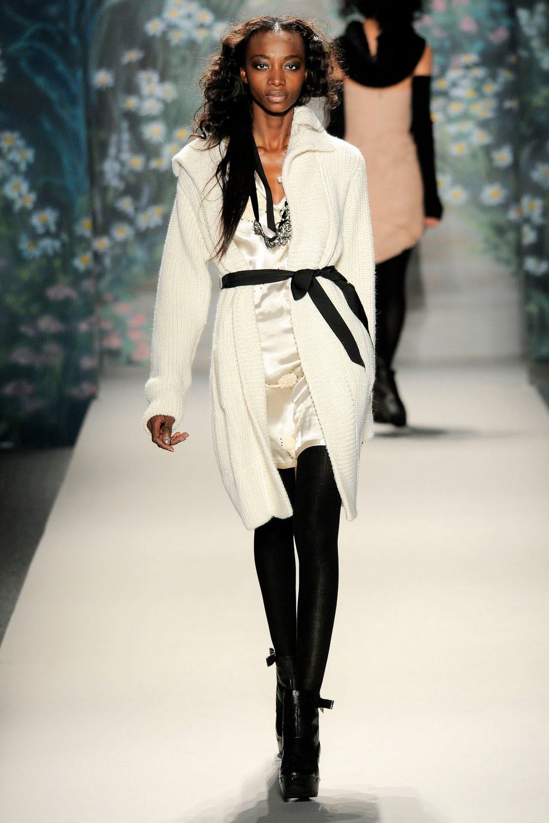 - Light fabrics of dresses and blouses, for example, chiffon, as practice shows, are perfectly combined with a coat with a heavy texture of knitting. The image turns out touchingly defenseless.