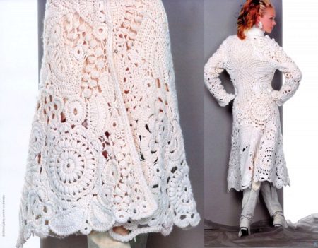 For the evening version of the summer knitted coat with or without a lining, you can use a very different from the Aranian, but also the Irish technique of guipure lace or lace.