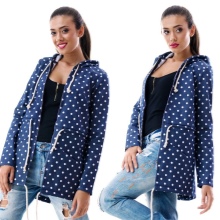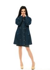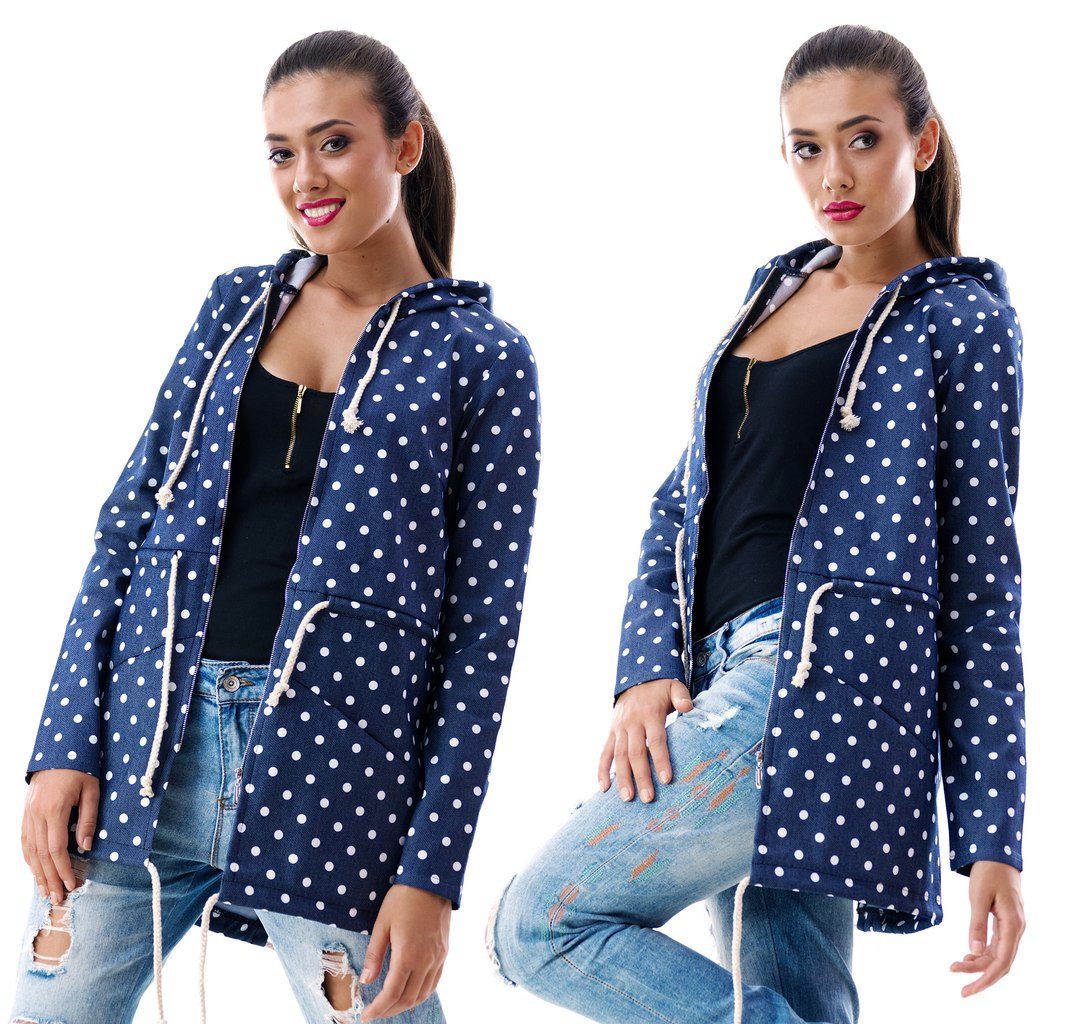 Summer version of the stylish and elegant parks of jeans. The shortened model, lightly fitted with a rubber band, has an interesting decor. These are neat patch pockets with metal buttons and an emblem in the form of a center, snow-white ties at the waist, an interesting form of a buckle. Free hood protects in windy weather. Wrapped sleeves look original - a cute print of small polka dots that adorn the wrong side of the product peeps out. With such a jacket, skinny jeans of a lighter tone look organic.