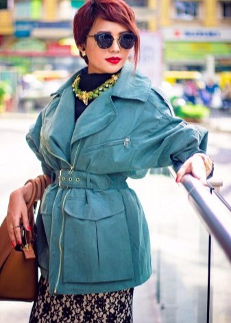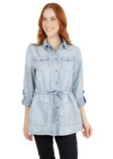 A denim jacket looks stylish with a strict cotton shirt, skinny trousers or leggings, which are tucked into leather or suede boots in a non-standard color.