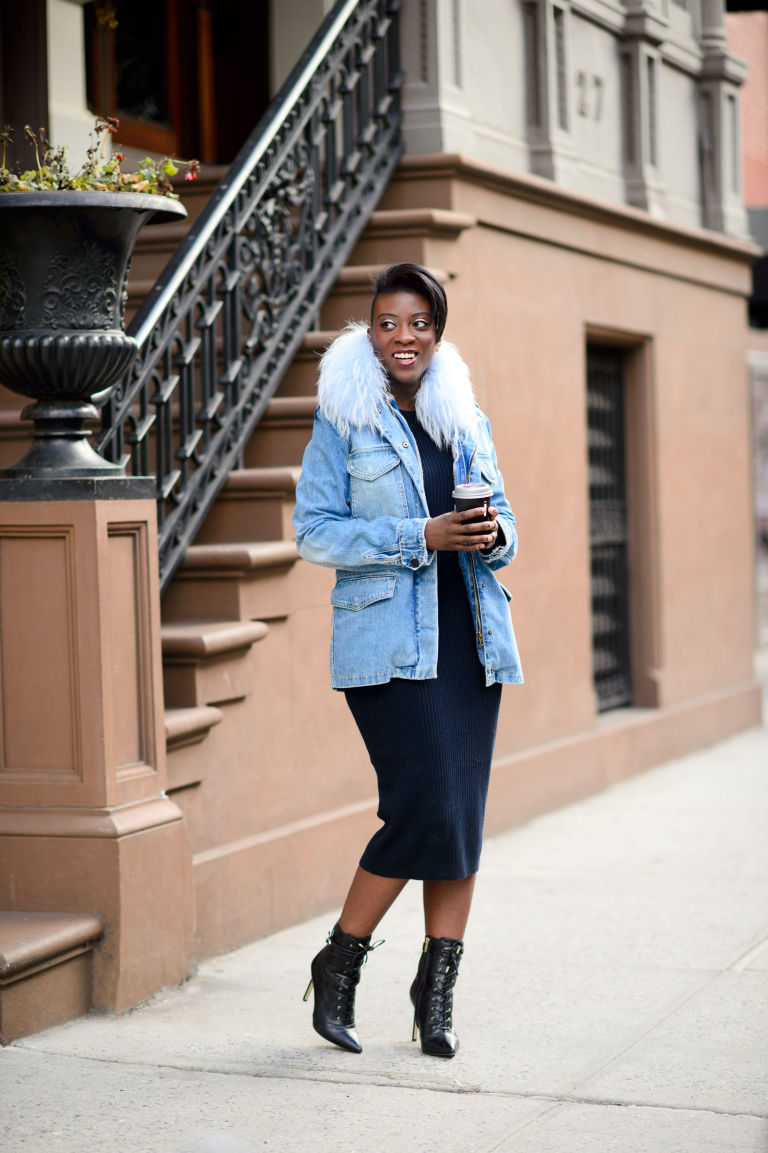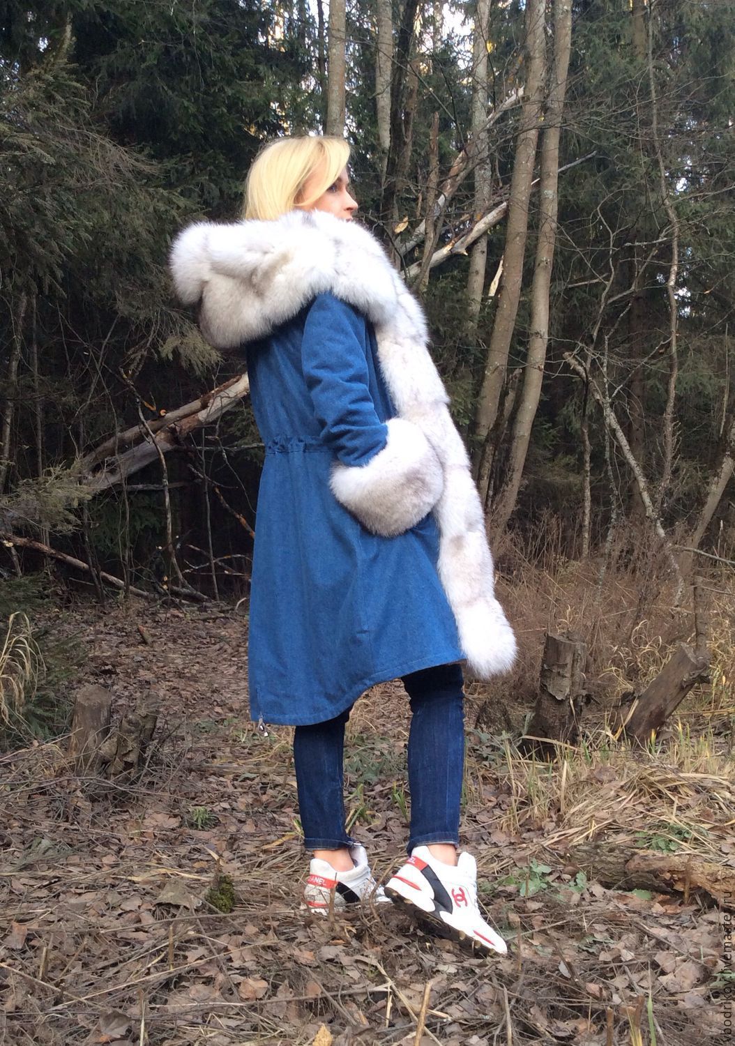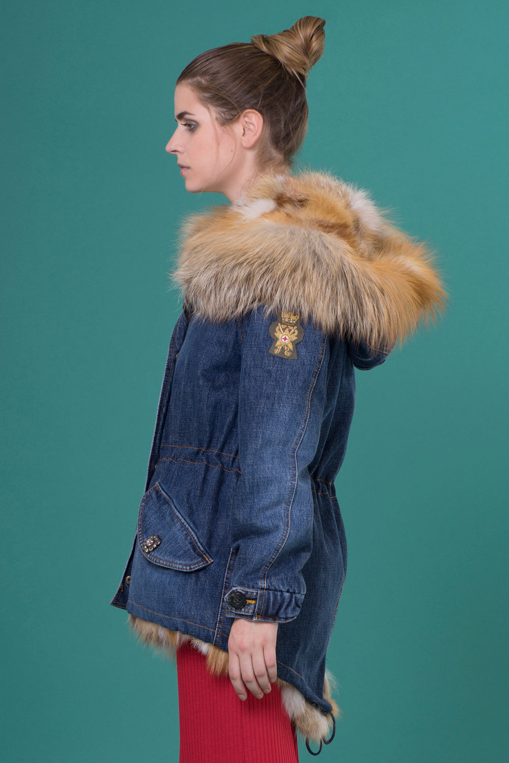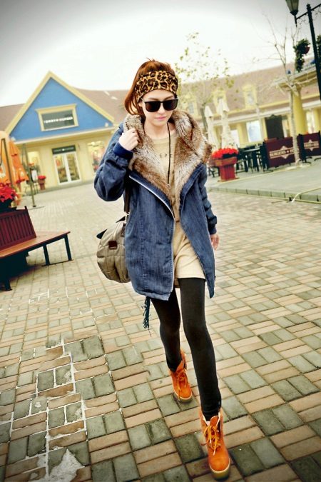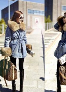 An interesting combination is a denim fur parka and a classic sheath dress. This duet is perfect boots with high heels. In addition, modern fashion allows even an evening dress to be worn under this outerwear, if the occasion requires. It is clear that the shoes must be appropriate. Also under the denim park you can easily wear a pencil skirt.