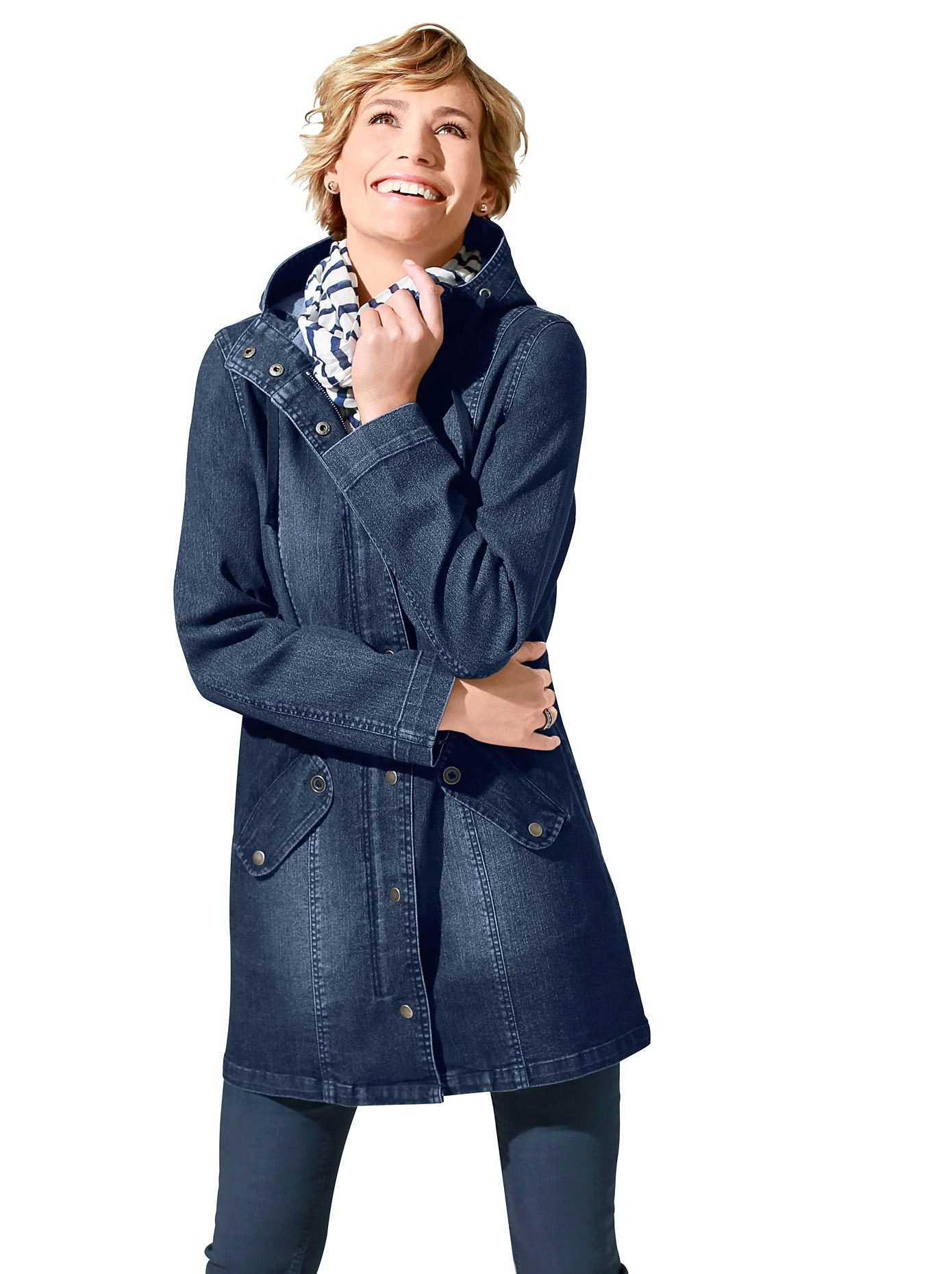 Denim of the park organically looks with clothes made of classic wool or cotton (dress, trousers, skirt). Beautifully this jacket looks with a knitted or knitted dress. Create an image with ankle boots.