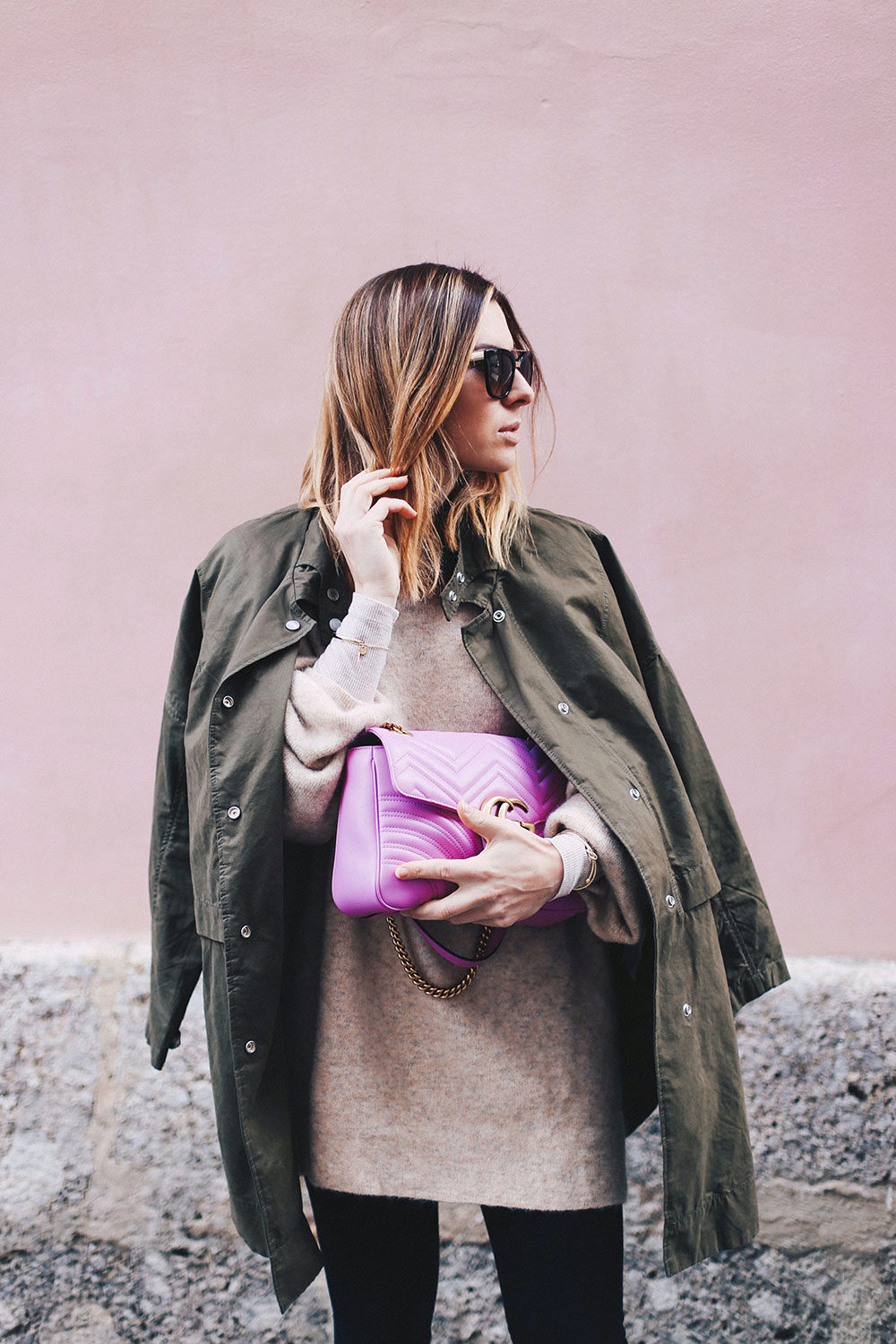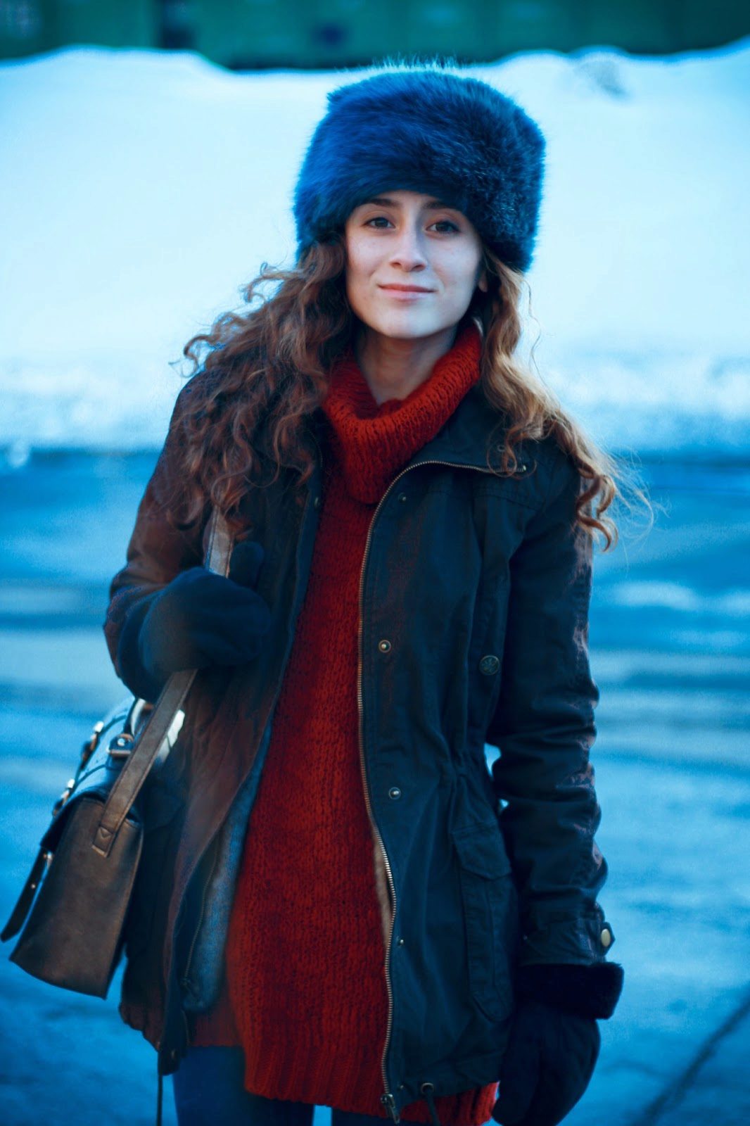 Another winter version with a fur lining and the same trim collar. The warm fur in this case compensates for the absence of additional details. Black leggings, beige knit tunic and red boots with thick soles are successfully combined with the jacket. A bulk bag matching the color of the tunic and a leopard print dressing make this youth look complete.