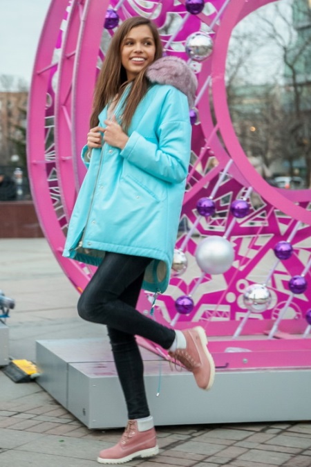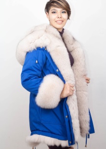 Blue parka with fur. The next element, without which it is difficult to imagine a fashionable park, is fur. Artificial or natural, discreet or vibrant colors. A particularly fashionable combination this year is blue + pink.