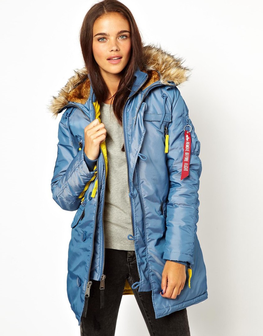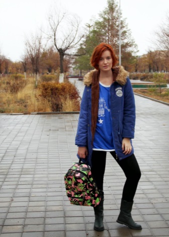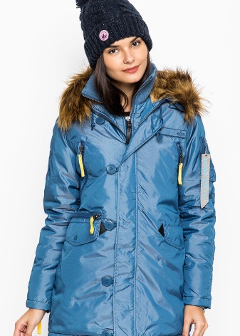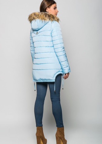 The parka is a voluminous outerwear, so more tight bottom should be selected under it, for example, skinny jeans or straight trousers. Looks beautiful with a blue parka and a straight midi or mini skirt, as well as a strict dress.