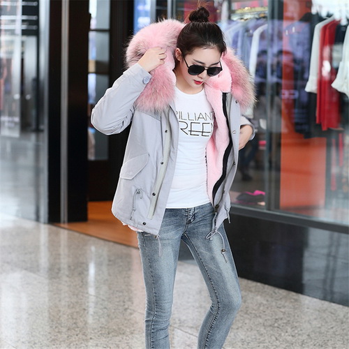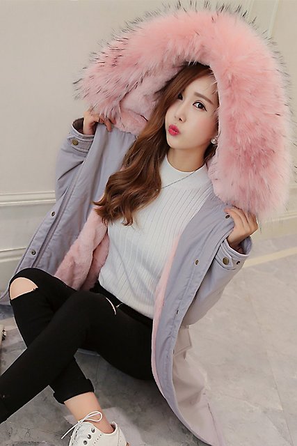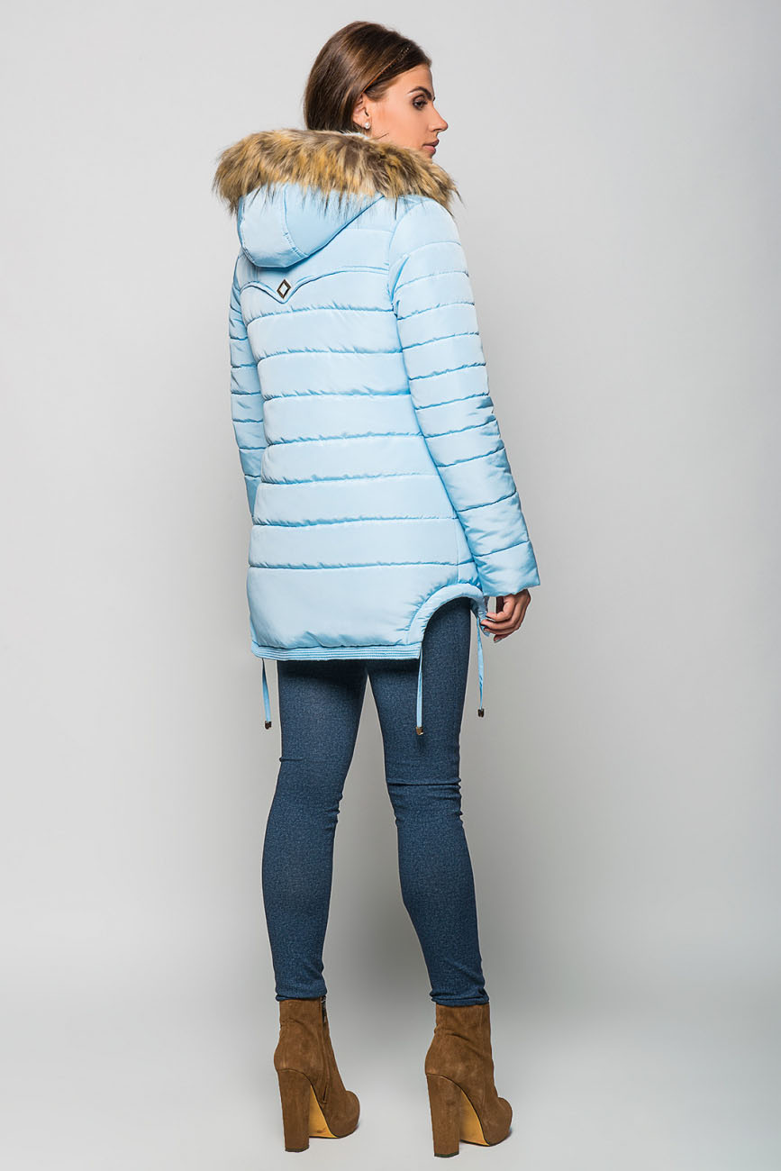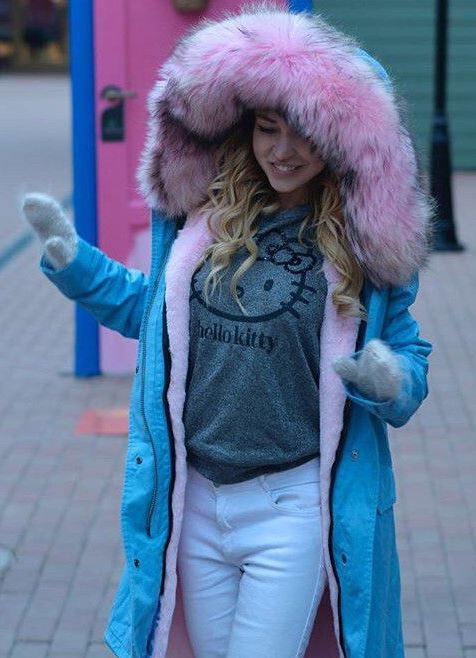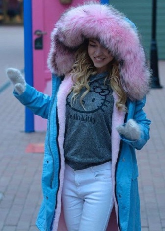 Pale blue parka with pale pink fur looks incredibly elegant and feminine. Very suitable for young girls and teenage girls.