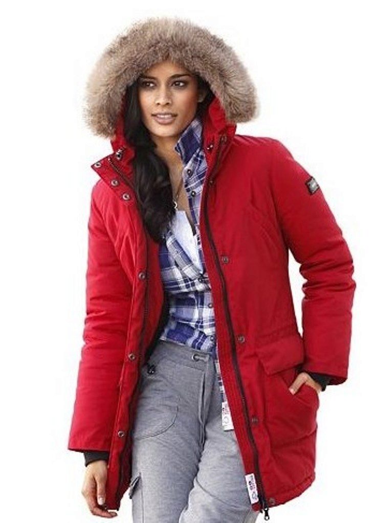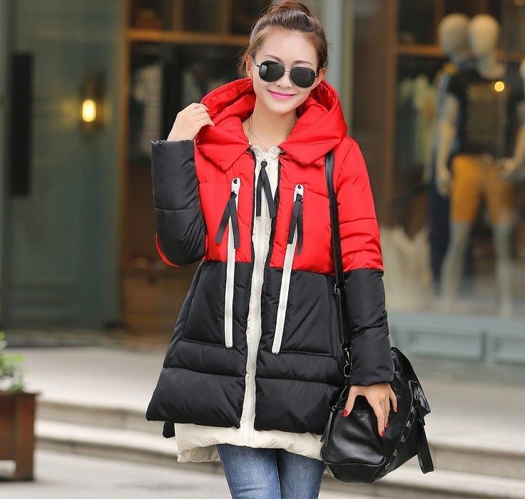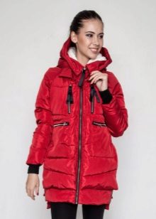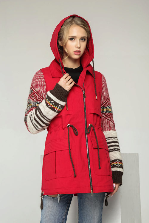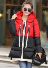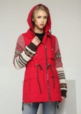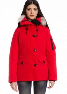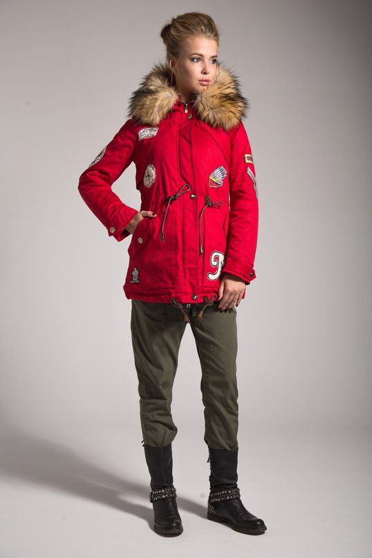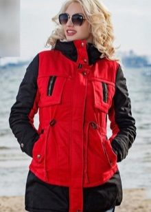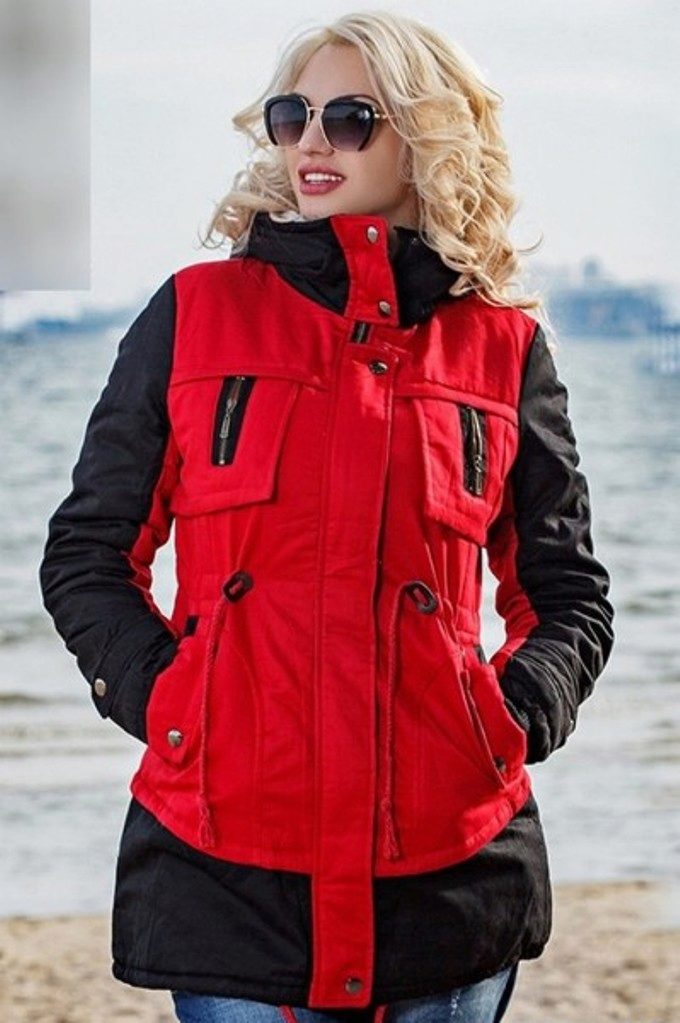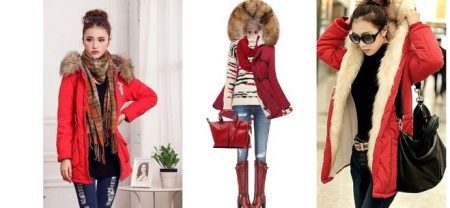 The red color of the jacket parks can also be in various original combinations. Separately dwell on such an option as the red and blue park. These colors can be very beautifully combined in outerwear (only blue should have a very dark shade so that the thing does not look tasteless). For example, blue sleeves and a buckle placket can be used, the rest of the jacket is red. It looks interesting model in which the top is made in one color, and the bottom in another. But these combined things are suitable only for slim girls. The red part of the figure should be of impeccable form, since the main attention will be focused on it.