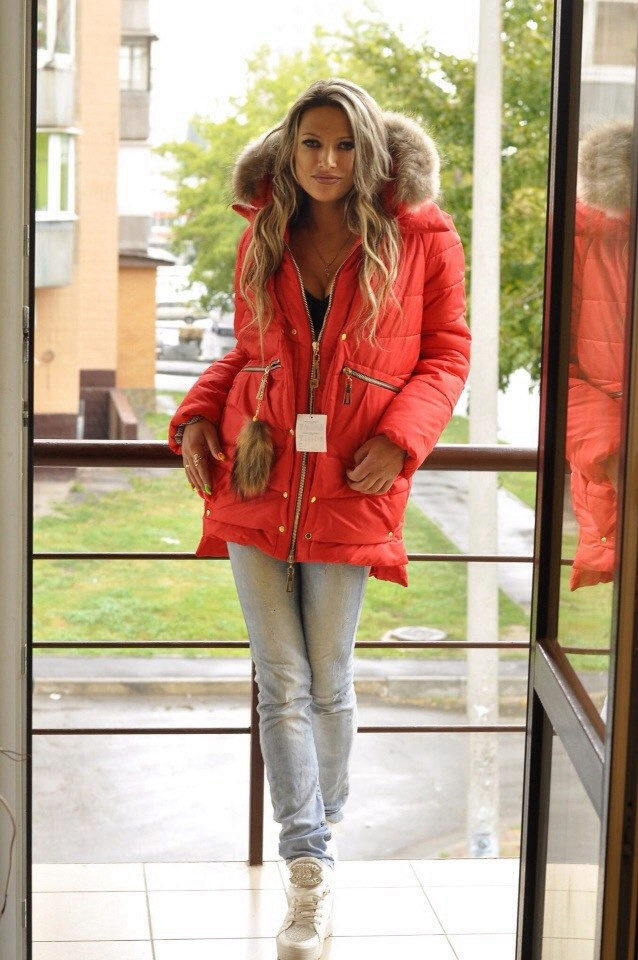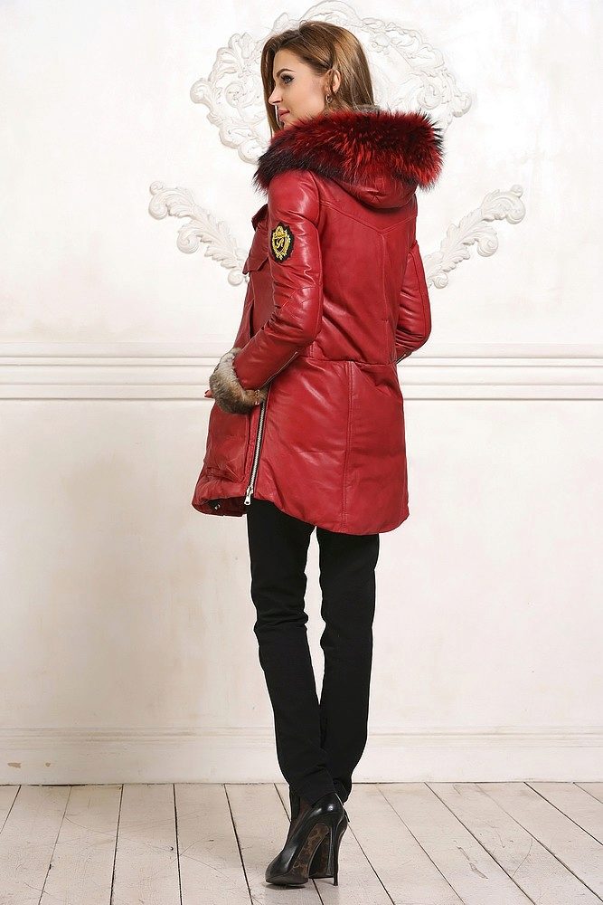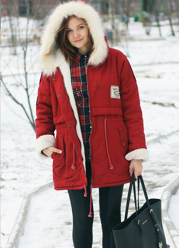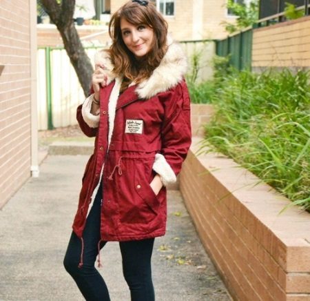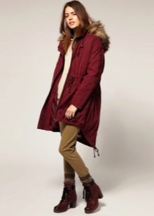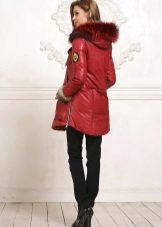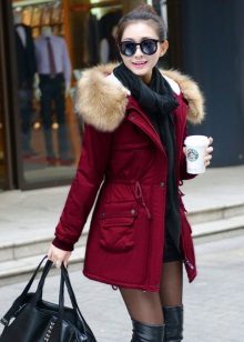 Already another shade of red, close to burgundy. The jacket of the park has a very spectacular decoration with light fur, which shimmers brightly in the sun. Wrapped cuffs of sleeves also look beautiful. Outerwear successfully complement the classic dark jeans.
