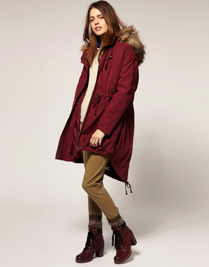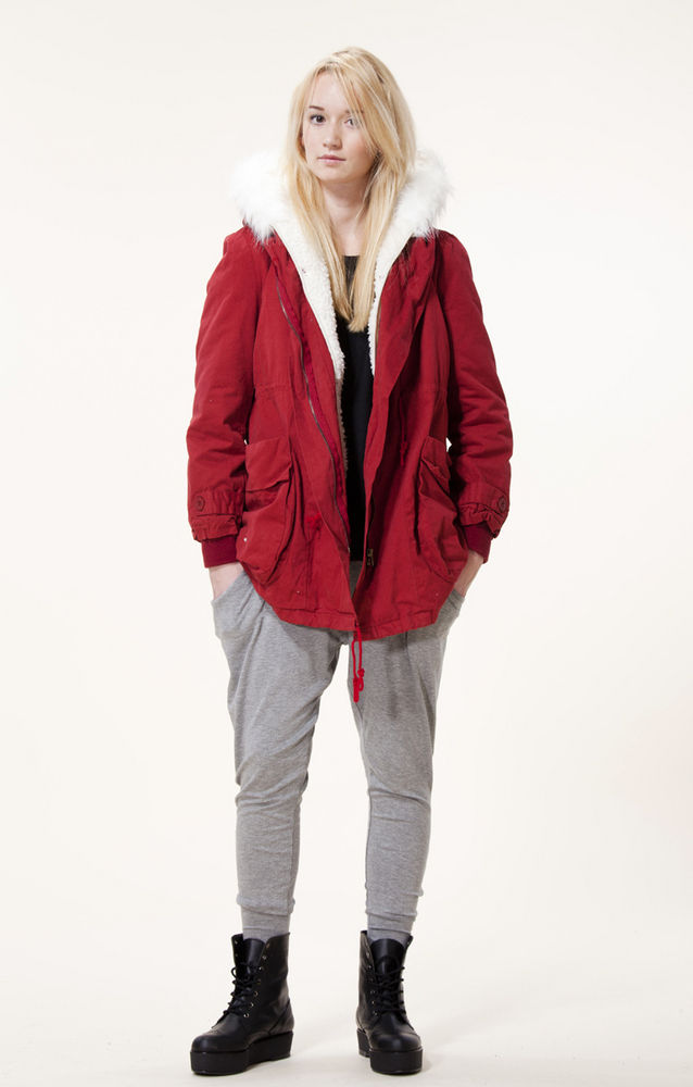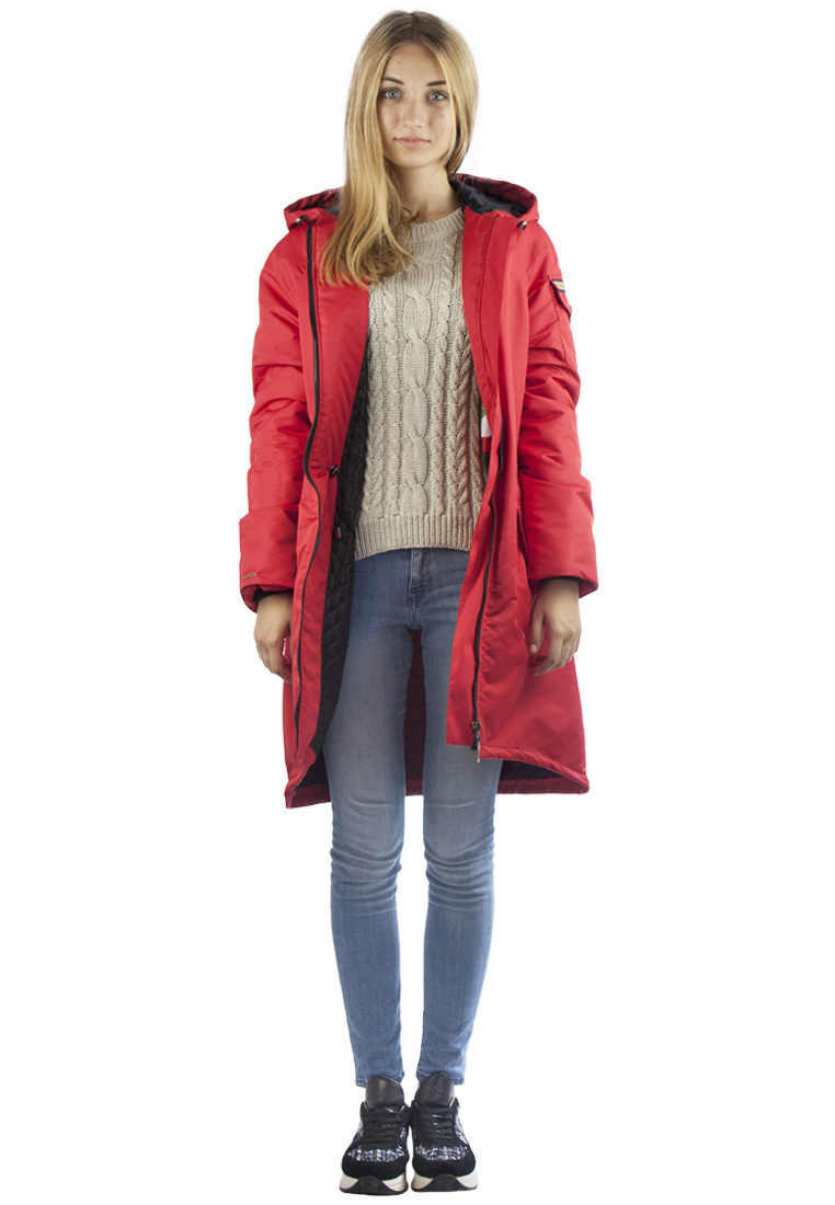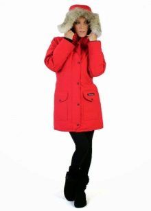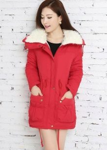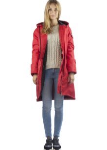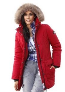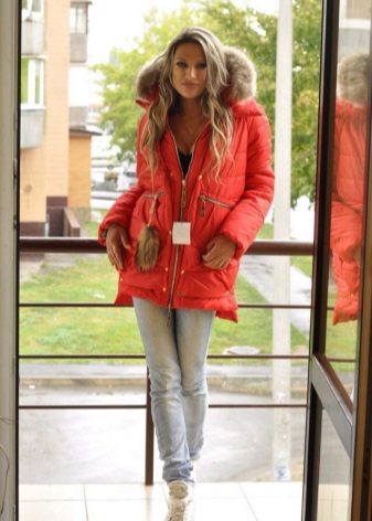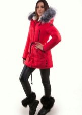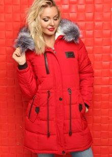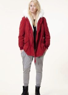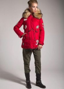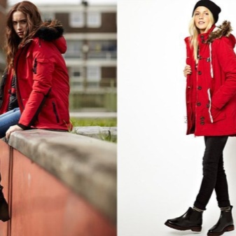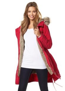 Red parka is well combined with jeans of any shades. and warm sweaters in classic black and white, as well as soothing tones (gray, beige, coffee with milk). Also, leggings and tight pants are suitable for this outerwear. An option for a walk can be made by combining a red park with short shorts, wearing tight tights and appropriate shoes (for example, youth high lace-up shoes or half boots on the wedge).