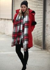With a red parka, a fashionable scarf-loud look will look great today. As a headdress, choose a knitted hat or cap, again a quiet low-key color. If your shoes are decorated with fur, find a hat with the same finish.