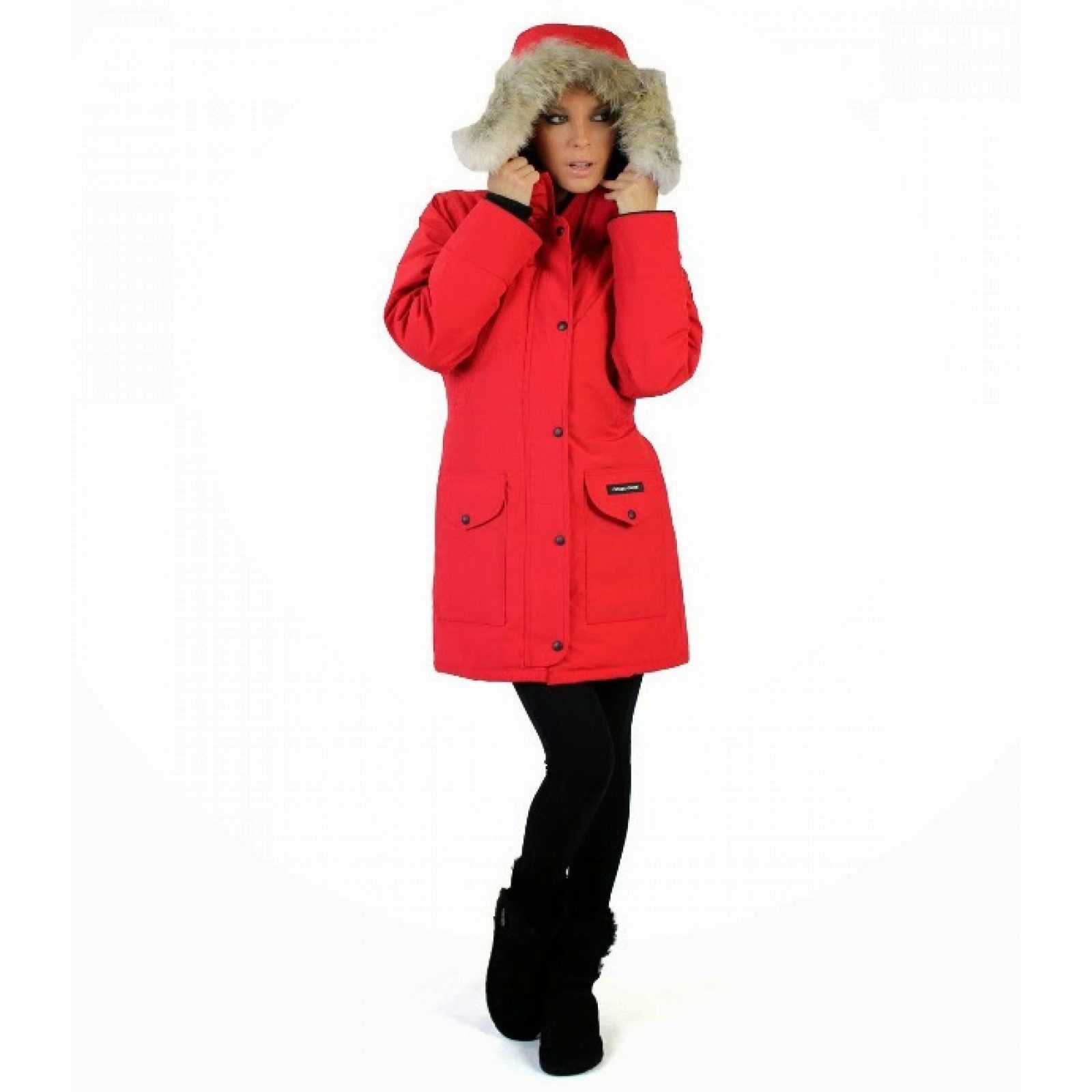 Brave youth image. Winter red parka with elegant silver fox fur trim. The highlight of the model is the unequal length in front and behind. Outerwear looks good with a leather zip mini skirt that demonstrates the slim legs of a girl. Black varnish boots with thick soles are in harmony with the skirt. Gray tights are appropriate in this case (in general, gray plus red is always a good combination). Bright red lipstick girl echoes the color of the parks.