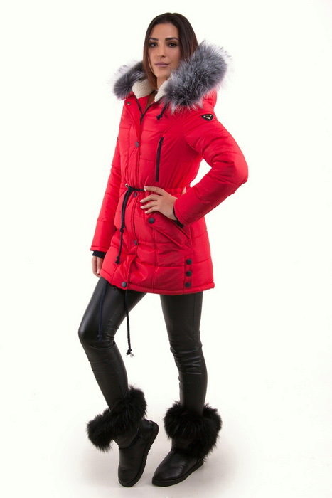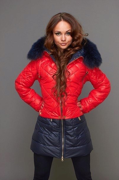 The original version of the winter park, built on a combination of bright red and dark blue. The top of the product is made in red, while the blue fragment starts from the hip. Only a girl with a good figure and a thin waist can afford such a model, since in this case all attention is focused on the torso. Fur and lining of the jacket are made in the same dark blue color. This ensemble is appropriate to look dark jeans. The tanned skin of the girl and her luxurious brown hair on the background of clothing look particularly advantageous.
