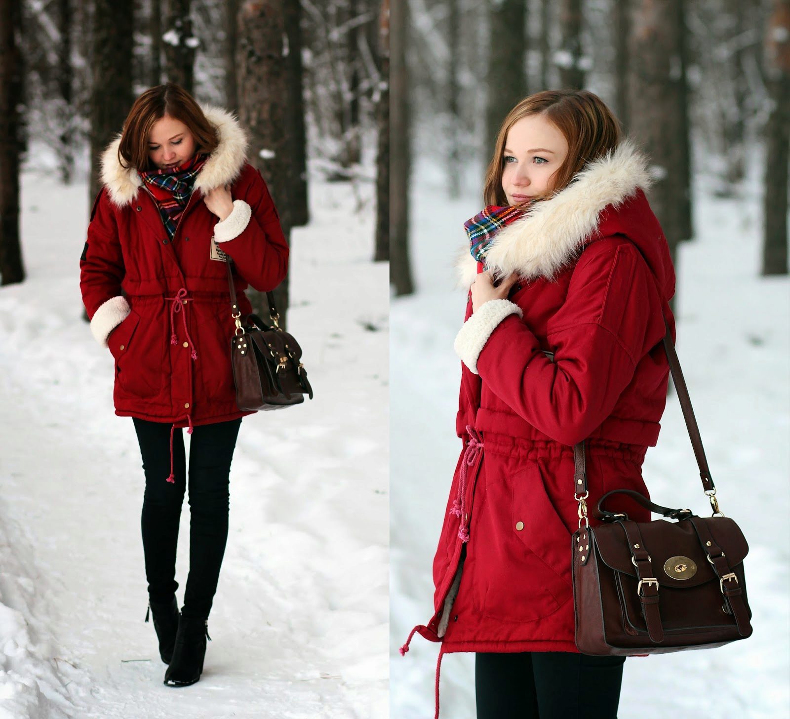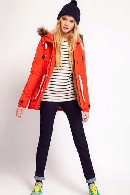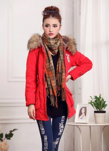 Another illustrative image. The bright scarlet color of the parks emphasizes the young age of the girl, surprisingly suits her skin and hair color. A navy tunic and youth ripped jeans are a great outfit to complete this casual look. We note with taste the chosen accessory - a long checkered scarf with a fringe now fashionable, the color range of which is in harmony with the color of the fluffy fur of a jacket collar.