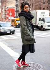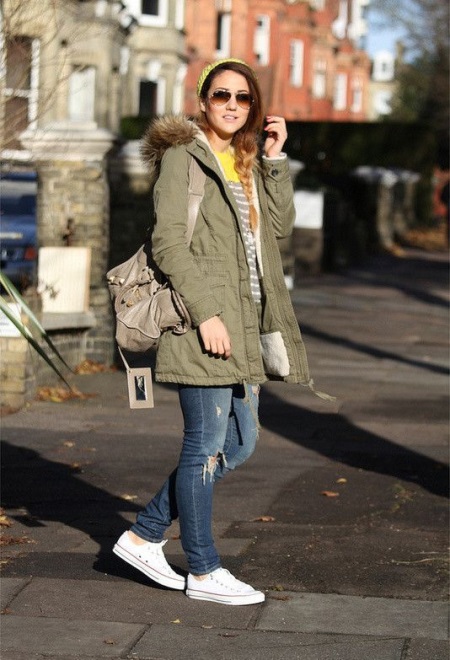 - For city walks in the fall or spring, a combination of jacket-parks and sneakers is suitable. Together they will create a sporty and laconic style.