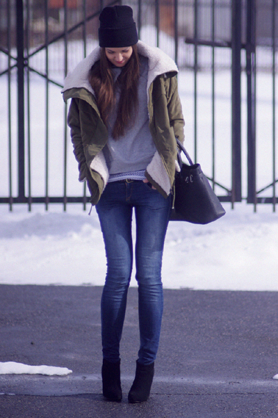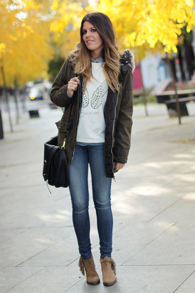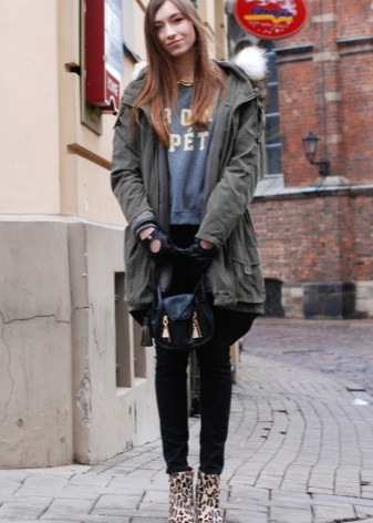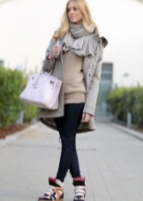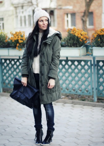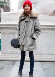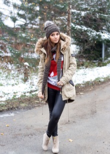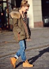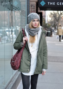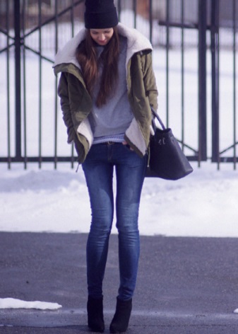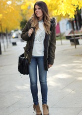 - Probably the most classic option is considered to be a combination of jacket parks with jeans, sweaters and boots. At low temperatures, complement such a set with a knitted set of hats and a scarf.