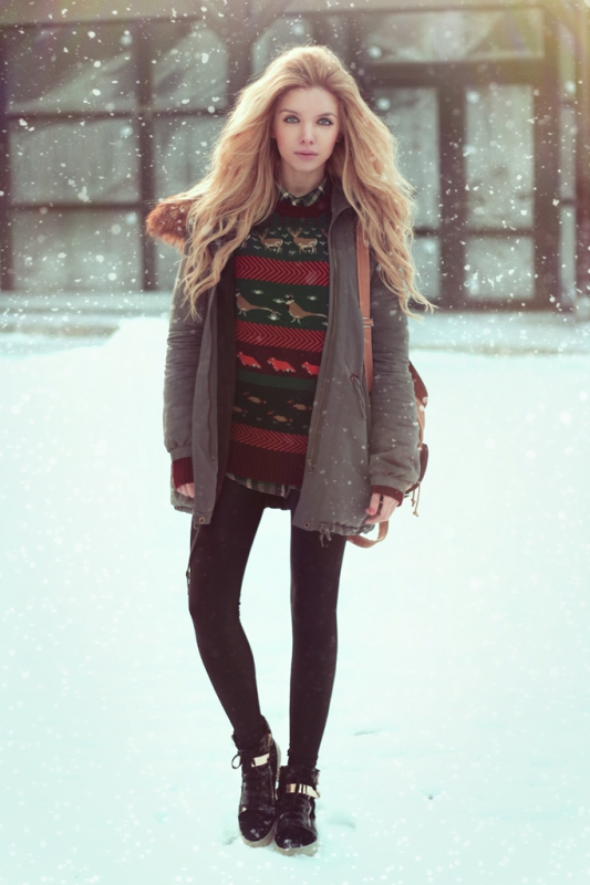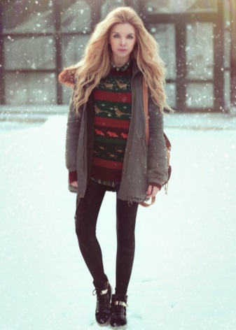 - For those who love more feminine images, a combination of thick opaque tights, ankle boots, skirts of warm fabrics will do.