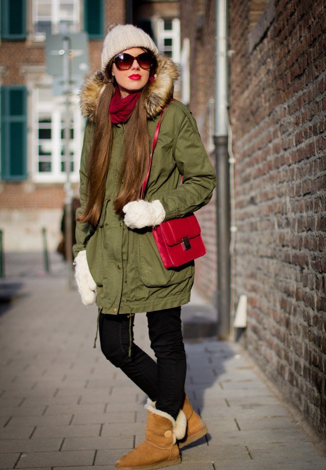 - Uggs in combination with knitted mittens and a hat will successfully fit into the kit with a fur trim, and a voluminous fun will complete this winter look.