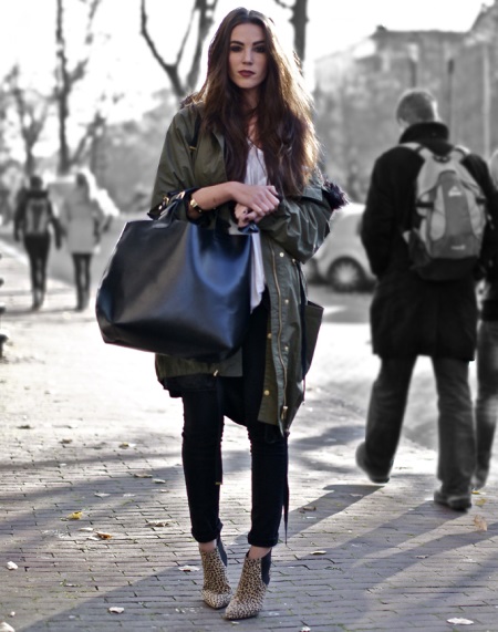 As for accessories, if everything is clear with a hat and a scarf, then everything is a bit more complicated with bags. Not every bag will be successfully combined with the park, here you need to focus on the style of the jacket itself, and then you can choose the best combination: leather or textile bags on a long strap and backpacks, sports volume bags.