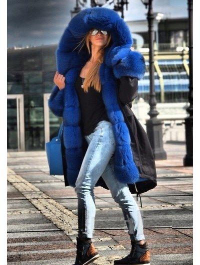 Such colors became popular precisely after the appearance of Ksenia Borodina in such a park. Park with blue fur - the choice is quite extravagant, and undoubtedly attracting attention. It is well protected from cold and rain, make the image fashionable and stylish. This park itself is a bright accent, so you should wear it with clothes of neutral colors - with gray, beige, black, dark blue.