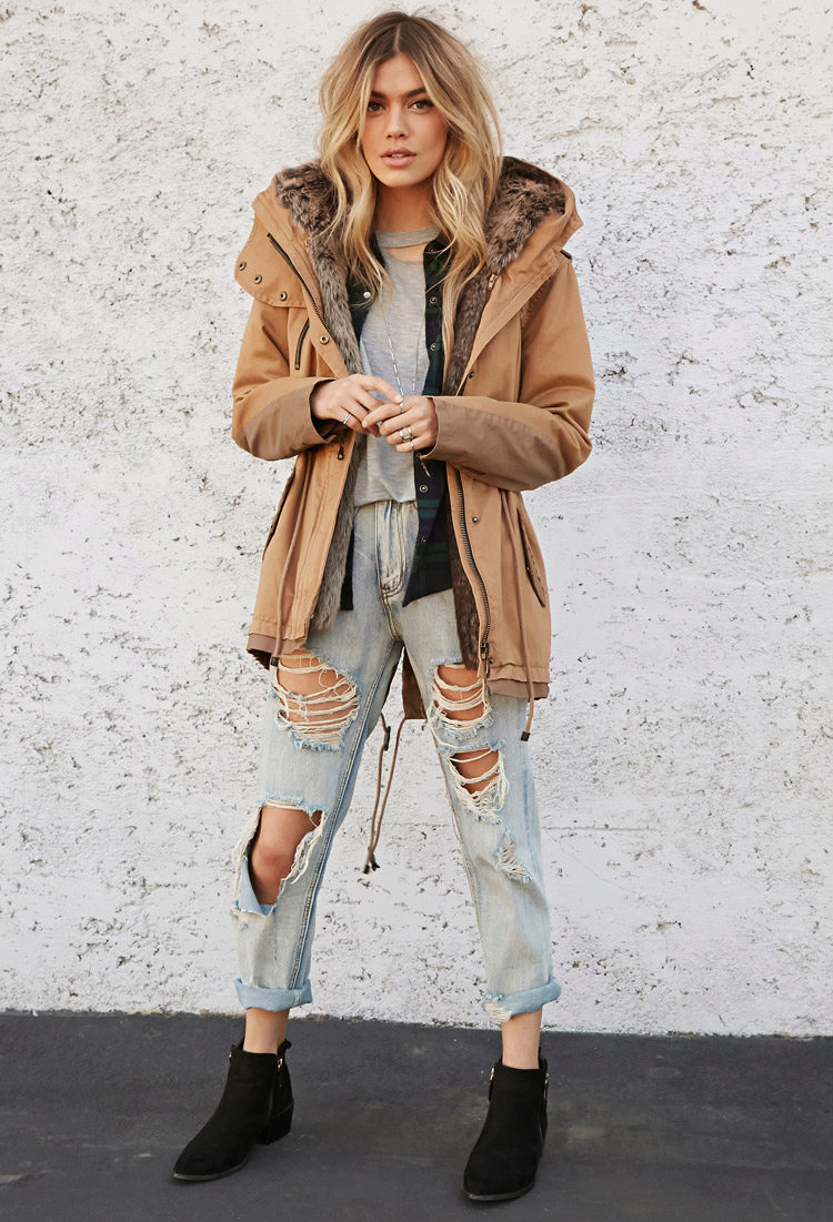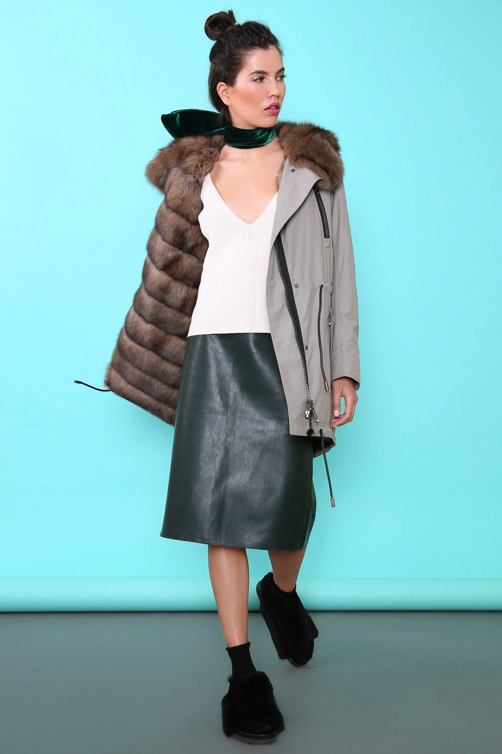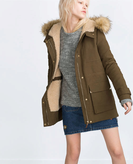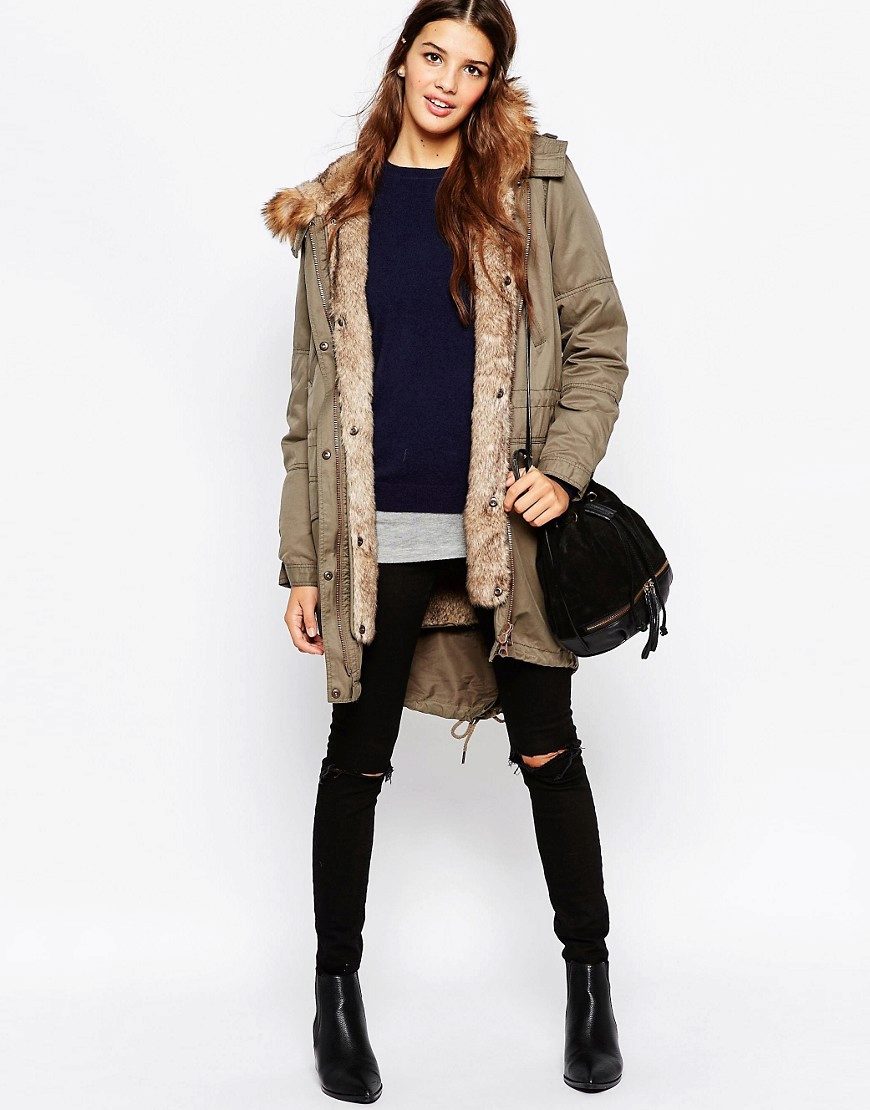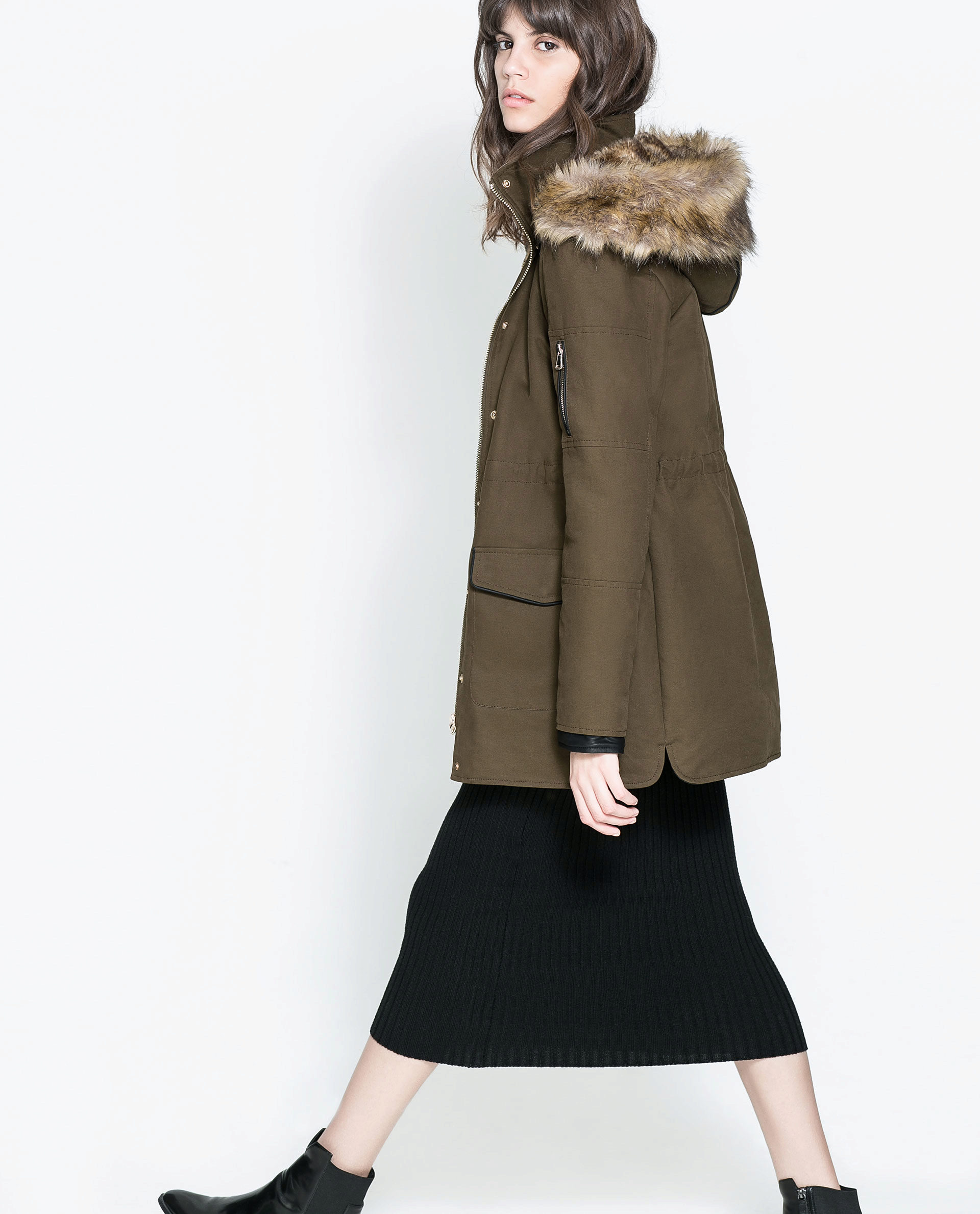 A park with fur will look great with a sheath dress or a shirt dress. This image is suitable for any occasion, even for work. The same applies to skirts in straight or slightly flared style. A pencil skirt or a cheeky mini will go well with a checkered shirt or sweatshirt.