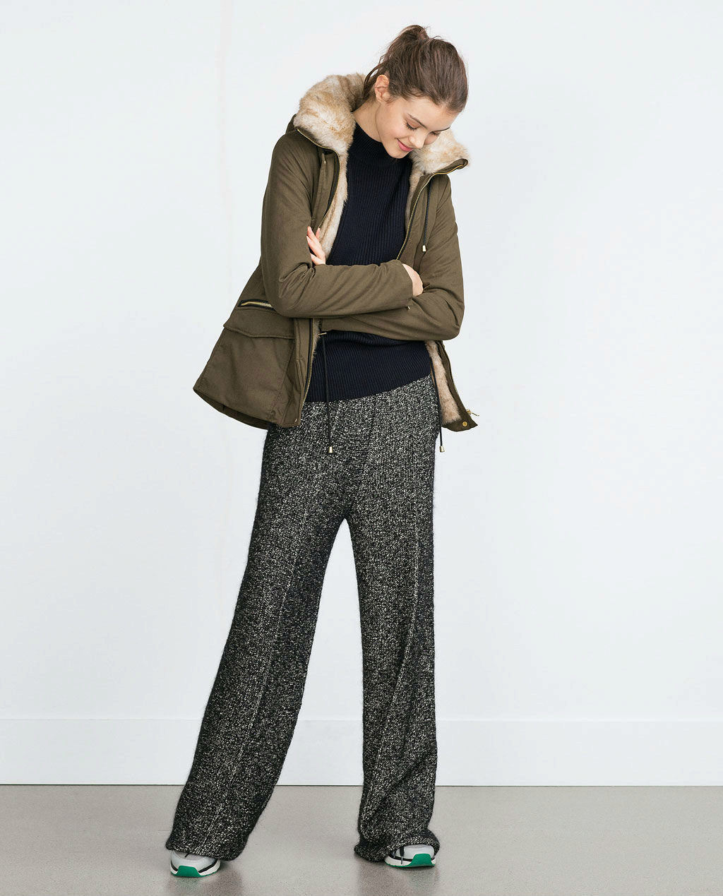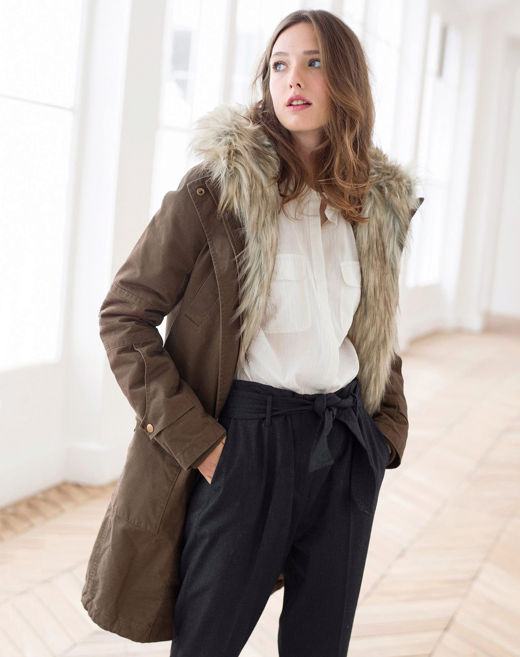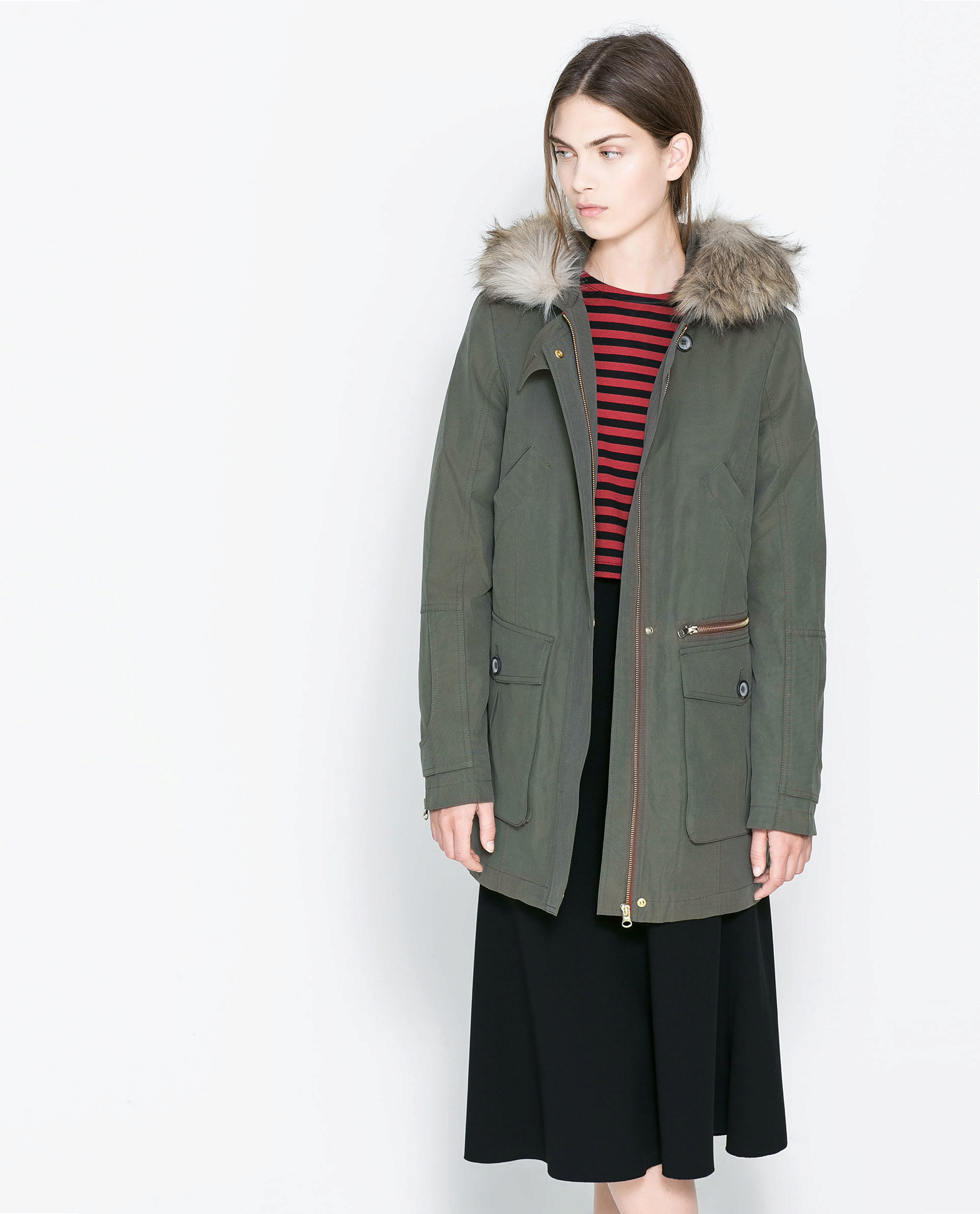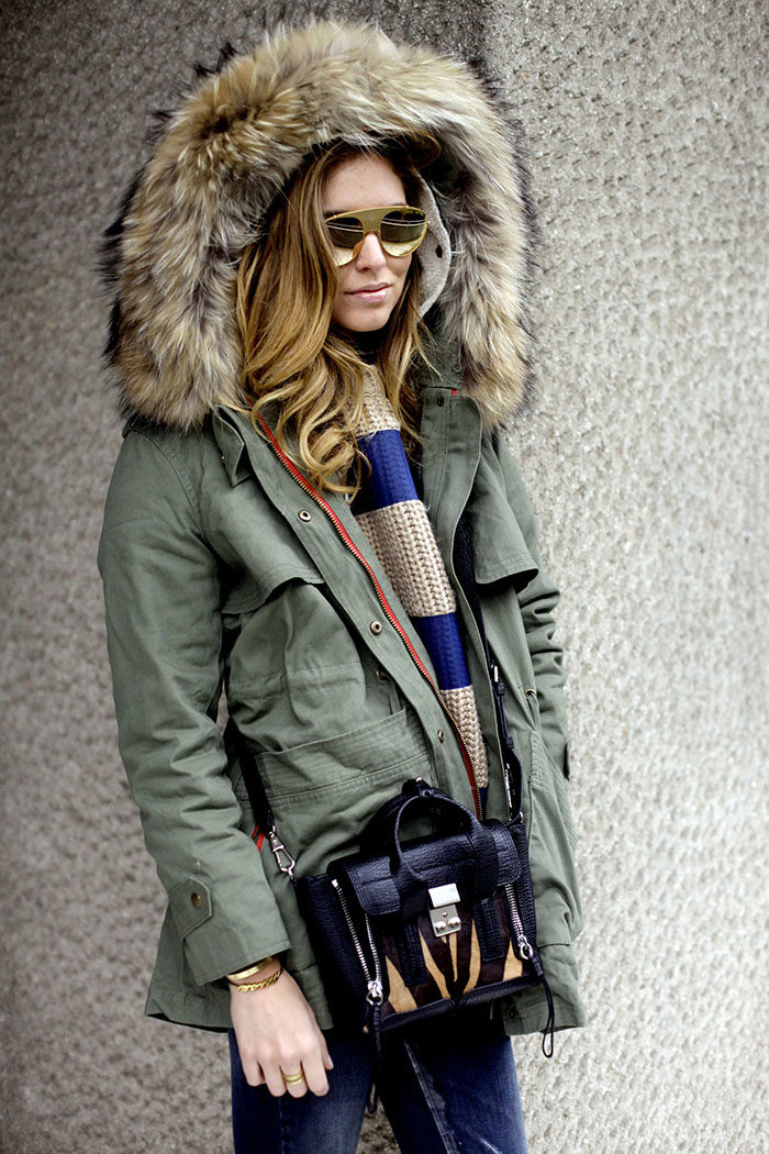 A park with fur will look great with a sheath dress or a shirt dress. This image is suitable for any occasion, even for work. The same applies to skirts in straight or slightly flared style. A pencil skirt or a cheeky mini will go well with a checkered shirt or sweatshirt.