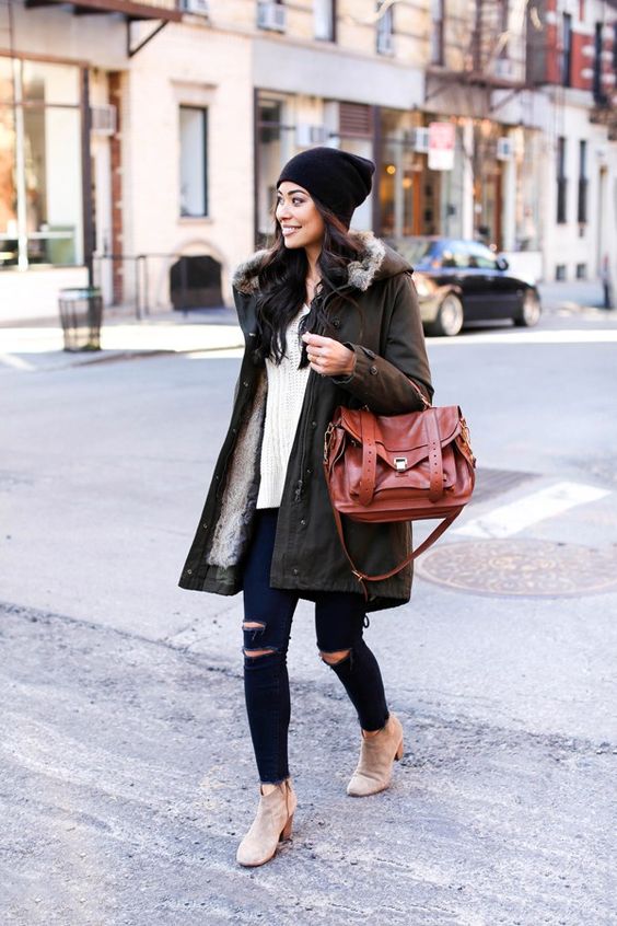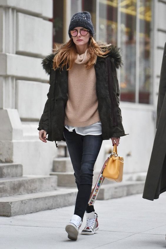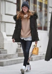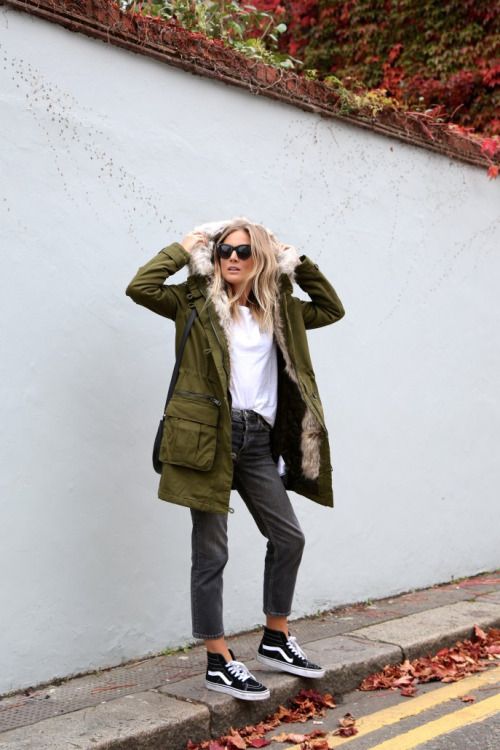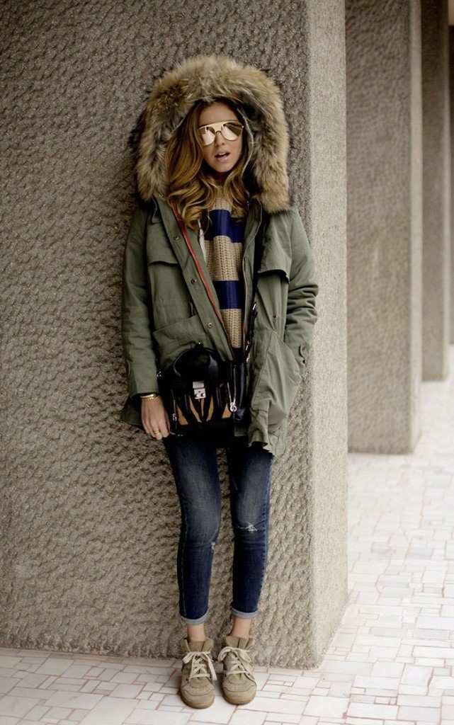 As for clothes, the win-win is skinny jeans or boyfriends. Depending on the color of the parks, it will look good black, blue, gray or even blue.