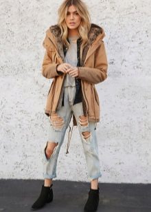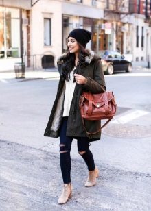 Therefore, the park goes well with any casual shoes. The best option is boots or ankle boots with thick heels. Pay attention to the model of suede, will look good leather. And it is better to refuse varnish boots, they are unlikely to fit the park.