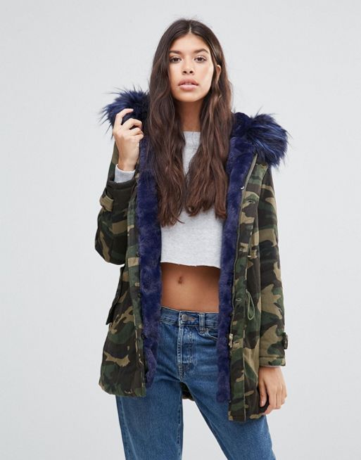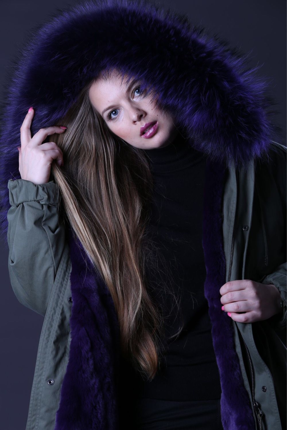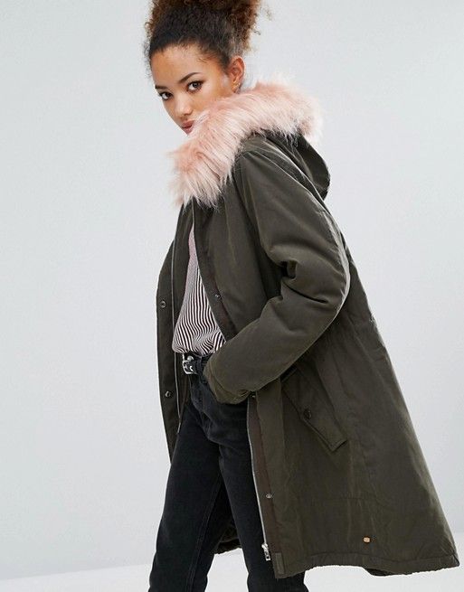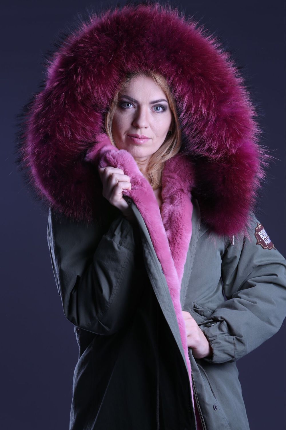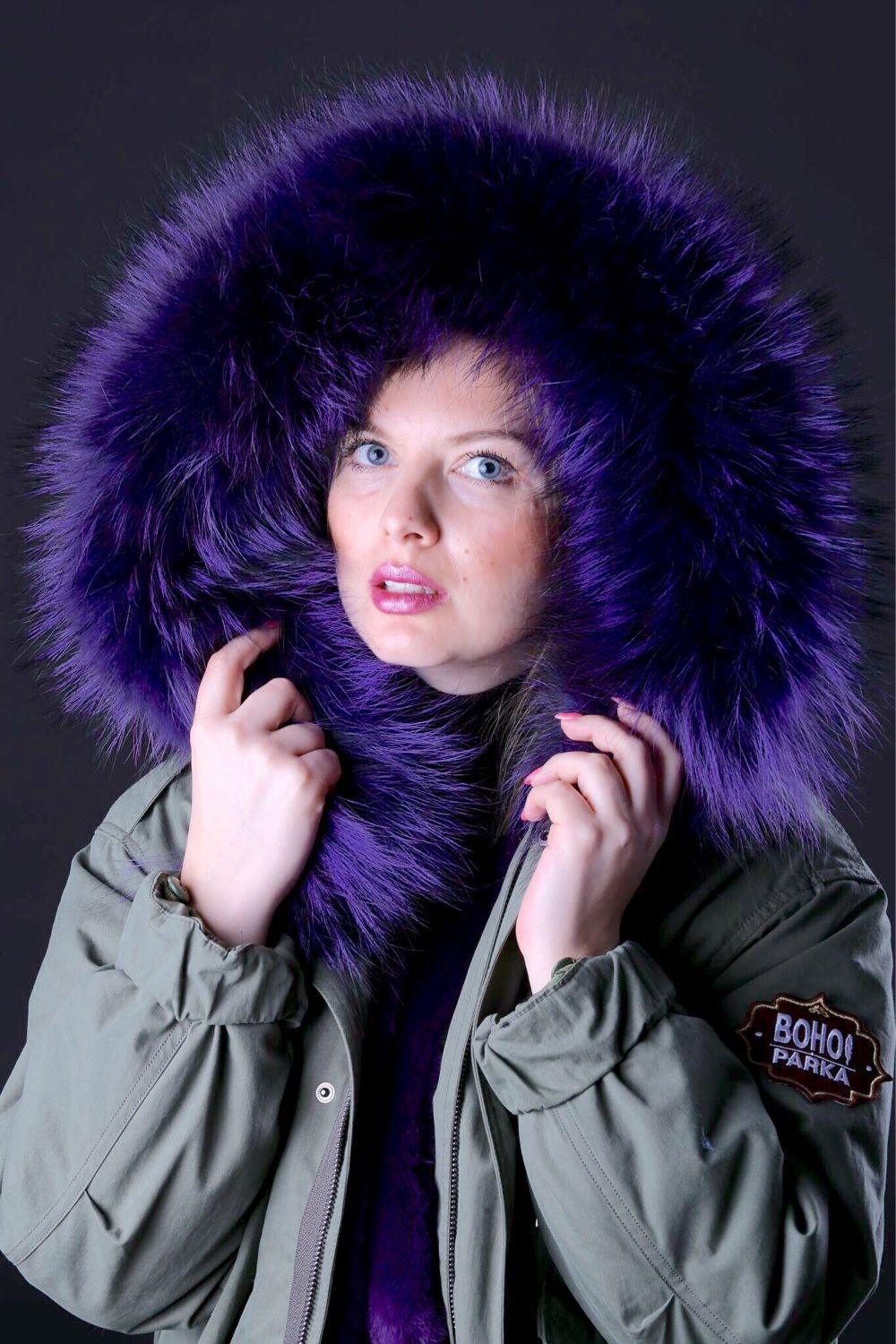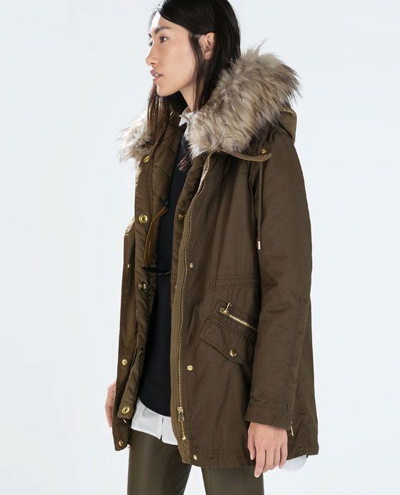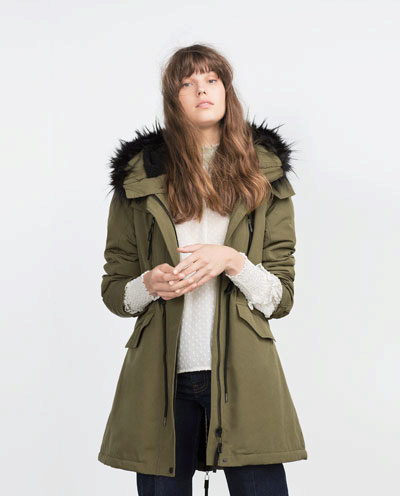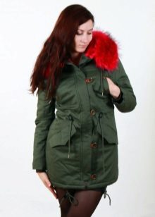 Green parka with red fur, with white fur, black and blue is in fashion.