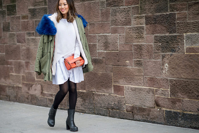 - A light white airy dress that can be complemented by thick black tights, thick-heeled boots and a khaki-colored park with blue fur will suit you for a date. The focus of the image is an orange clutch. Your chosen one will definitely appreciate this image!
