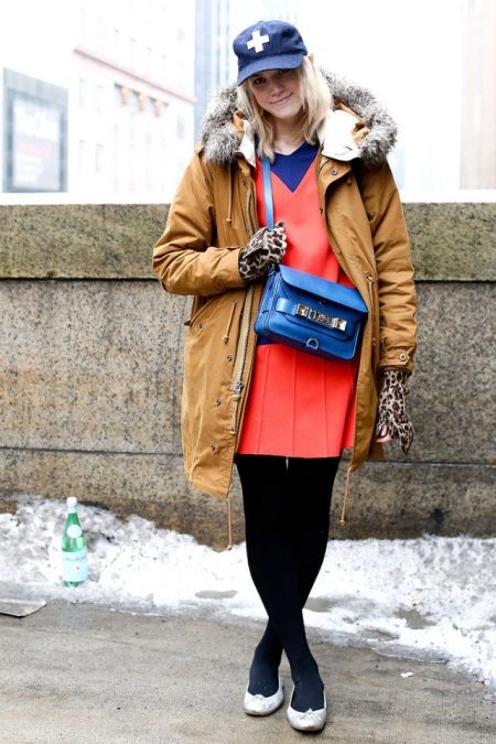 - Custom image for a special occasion. A bright orange short dress with blue accents, black tights, a mustard coat with fur and beige ballet flats. This mix is complemented by blue accessories - a blue baseball cap and a handbag on a long strap. The final touch is a leopard print glove. Bold and original.