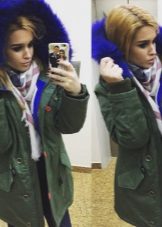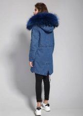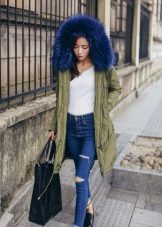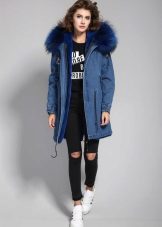 Parks trimmed with blue fur will be best combined with casual wear - jeans or leggings, sweatshirt or raglan. Shoes should be chosen on a low run, or with a rough sole, and it can be both low shoes and high boots. You can add an image with a volumetric scarf, snood or hat. Young girls often combine the park with funny gloves and hats of bright colors.