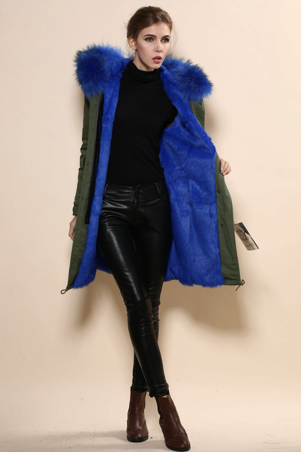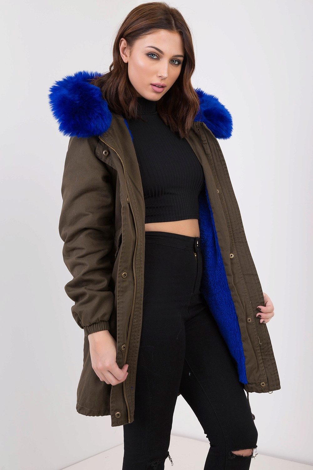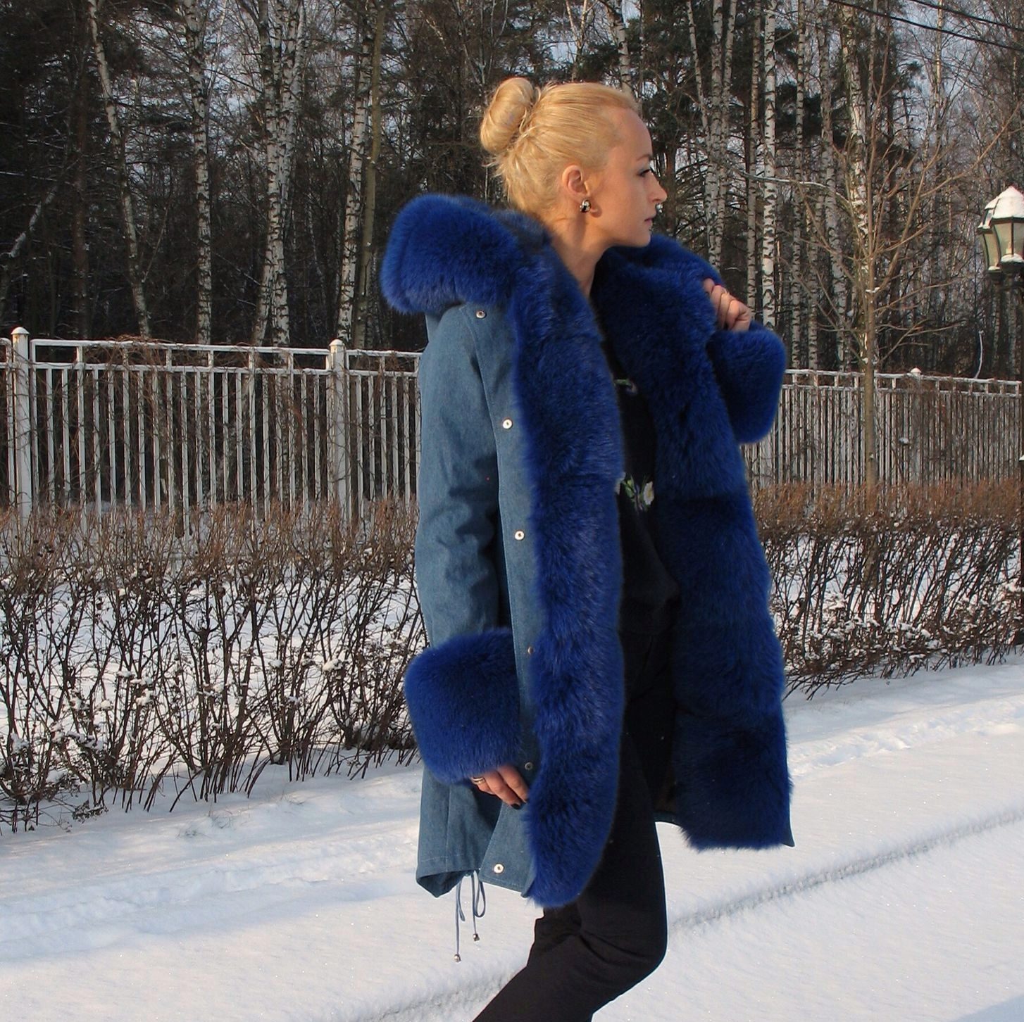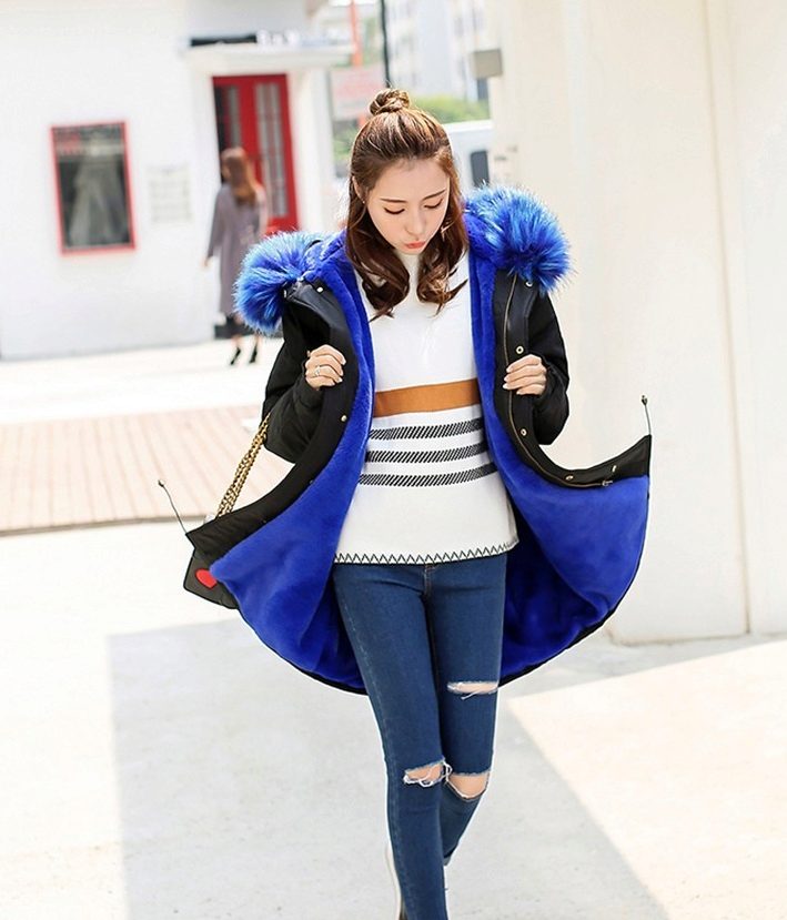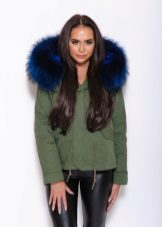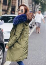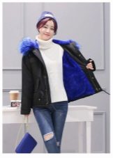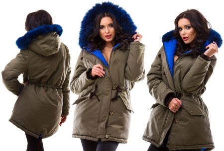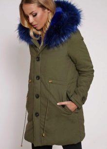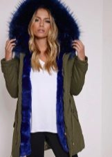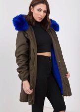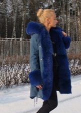Bright blue fur can adorn the park not only of a similar color, but also of a completely contrasting one. The most popular combinations are blue with khaki. Also, bright fur will be a good addition to the jacket in black, gray, brown and brick colors.