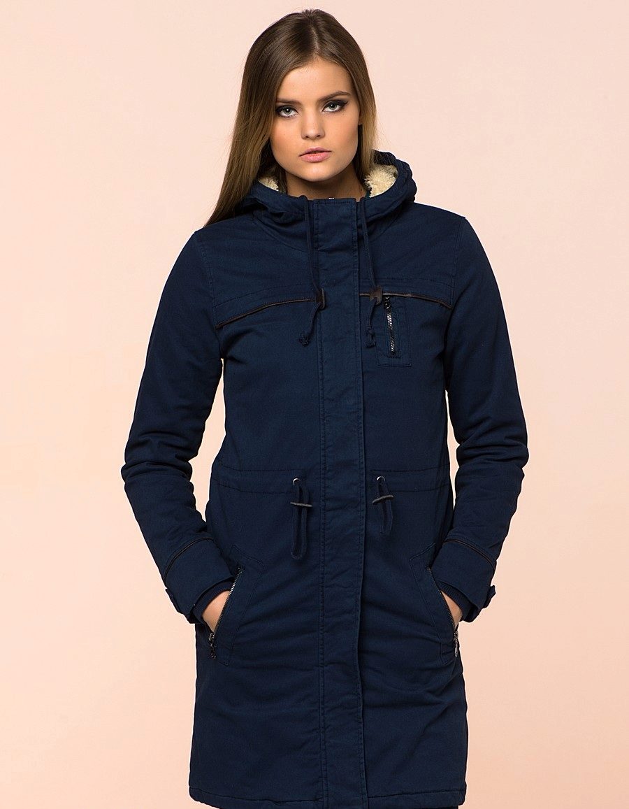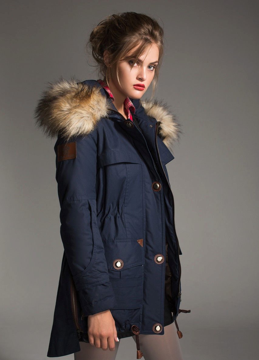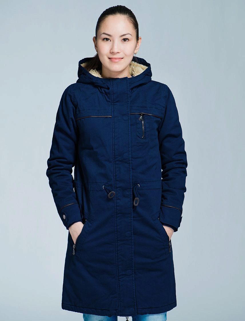 The classic version of the winter women's blue parks is the model below the thigh on a quilted diagonal lining containing modern synthetic filler, or on a lining of light faux fur. Extended winter parks are a good competitor to down jackets. The winter park has an inflated stand-up collar that covers the lower part of the face from frost, as well as a deep hood, a pair of patch pockets, an inside pocket and often an additional pocket on the sleeve, fastened with a hidden zipper.