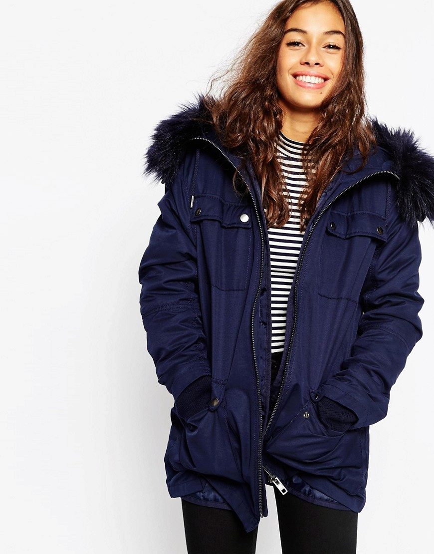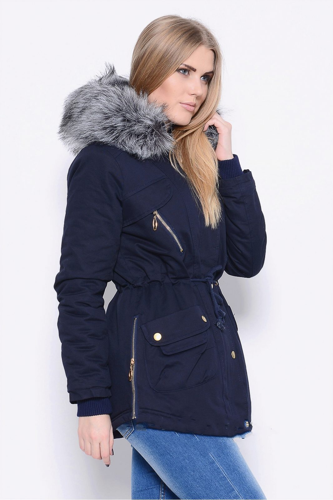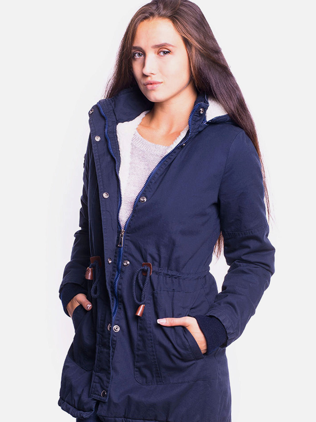 The classic version of the winter women's blue parks is the model below the thigh on a quilted diagonal lining containing modern synthetic filler, or on a lining of light faux fur. Extended winter parks are a good competitor to down jackets. The winter park has an inflated stand-up collar that covers the lower part of the face from frost, as well as a deep hood, a pair of patch pockets, an inside pocket and often an additional pocket on the sleeve, fastened with a hidden zipper.