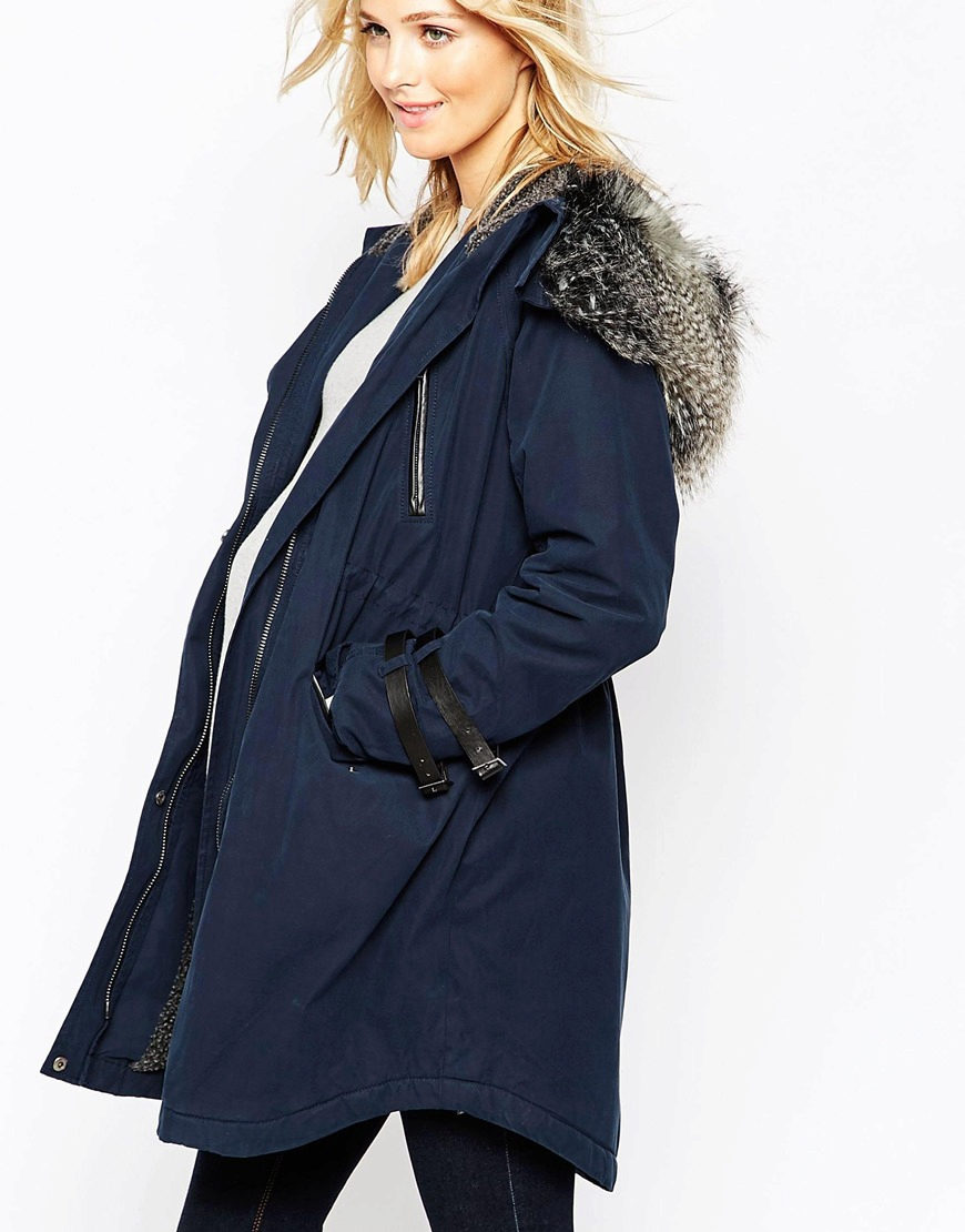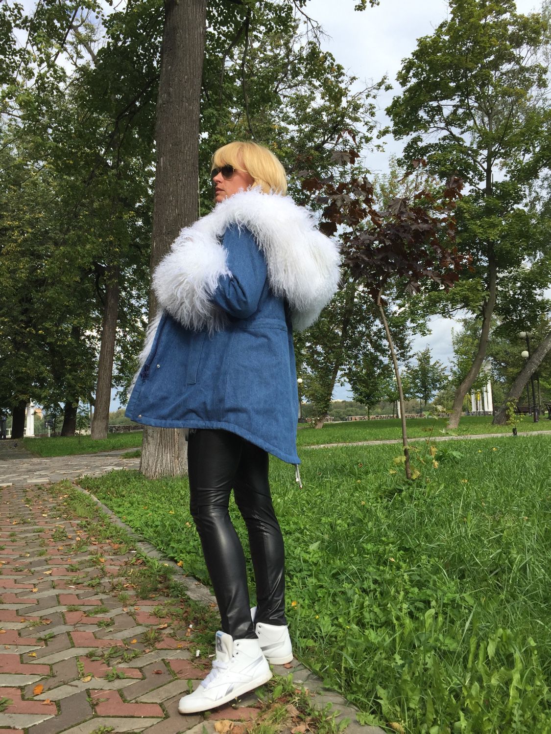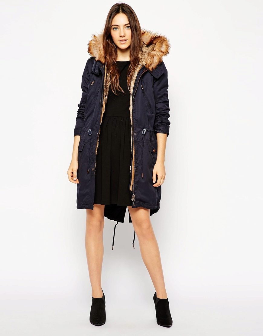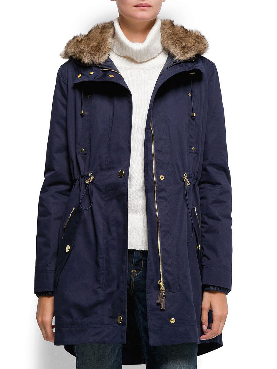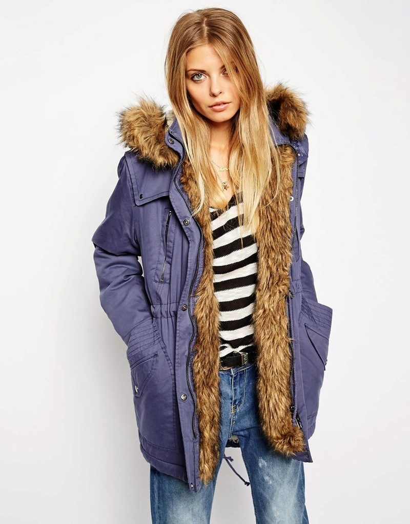 Autumn parks are usually made from durable, moisture-resistant fabrics with a thin lining or without it. Fur, if present, is usually loose artificial, and it is located only in the hood and on the back approximately to the waist. The beige and brown fur goes well with the blue park.